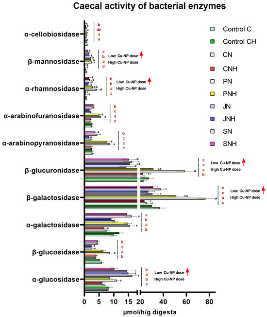 Effects of dietary copper source and fibre composition on the caecal activity of bacterial enzymes in rats (n = 10 per group). Control groups (C and CH) received CuCO3, providing 6.5 or 13 mg Cu/kg with 8% cellulose as the fibre source. Experimental groups were supplemented with copper nanoparticles (Cu-NP) at corresponding levels (6.5 or 13 mg Cu/kg) combined with different dietary fibres: cellulose (CN, CNH), pectin (PN, PNH), inulin (JN, JNH), or psyllium (SN, SNH). Values are presented as means ± SEM. Mean values with different letters differ significantly (p < 0.05). Black letters are shown only when a significant diet × fibre interaction was detected (p < 0.05). Groups fed 6.5 mg/kg Cu-NP (CN, PN, JN, SN) were compared with the control C group using Student’s t-test (# indicates a significant difference vs. C), and those fed 13 mg/kg Cu-NP (CNH, PNH, JNH, SNH) were compared with the CH group (& indicates a significant difference vs. CH). Statistically significant differences (p < 0.05) observed between the types of dietary fibre are presented with red letters. The red arrow marks a statistically significant (p < 0.05) increase in the measured parameter, demonstrating the dose-dependent effect of Cu-NP supplementation.