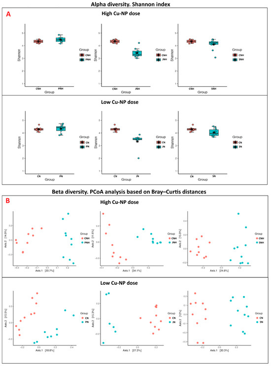 Alpha (A) and beta (B) diversity of the caecal microbiota. Alpha diversity was assessed using the Shannon index, with statistically significant differences indicated for comparisons with p < 0.05. The horizontal line within the box plots represents the median, the asterisk indicates the mean, and individual points correspond to Shannon index values for each sample. Beta diversity was assessed using PCoA based on Bray–Curtis distances, with significance set at p < 0.05. Cu-NP were administered to experimental groups at low and high dietary levels of 6.5 and 13 mg Cu/kg, respectively. CN, diet with low Cu-NP dose and cellulose; PN, diet with low Cu-NP dose and pectin; JN, diet with low Cu-NP dose and inulin; SN, diet with low Cu-NP dose and psyllium; CNH, diet with high Cu-NP dose and cellulose; PNH, diet with high Cu-NP dose and pectin; JNH, diet with high Cu-NP dose and inulin; SNH, diet with high Cu-NP dose and psyllium.