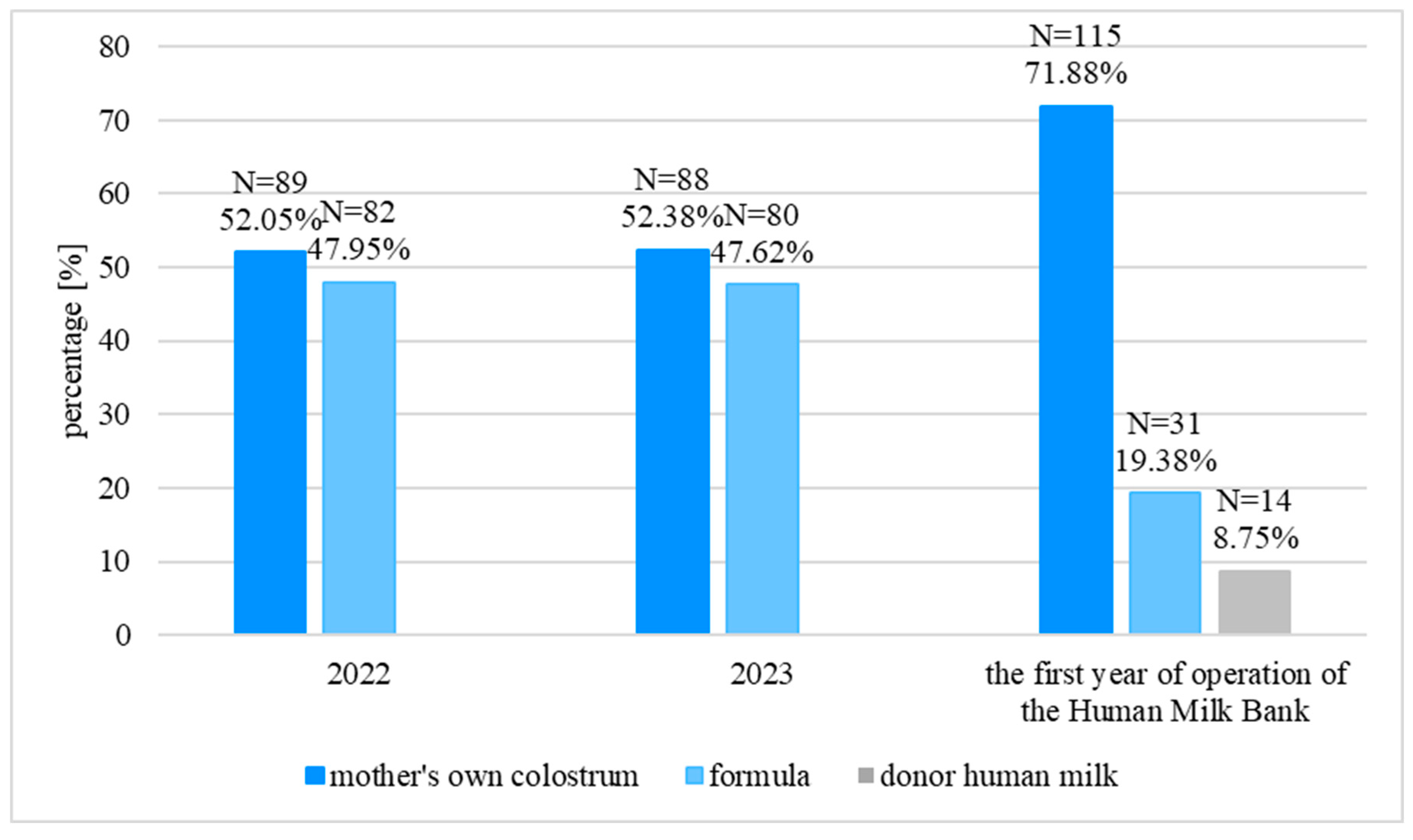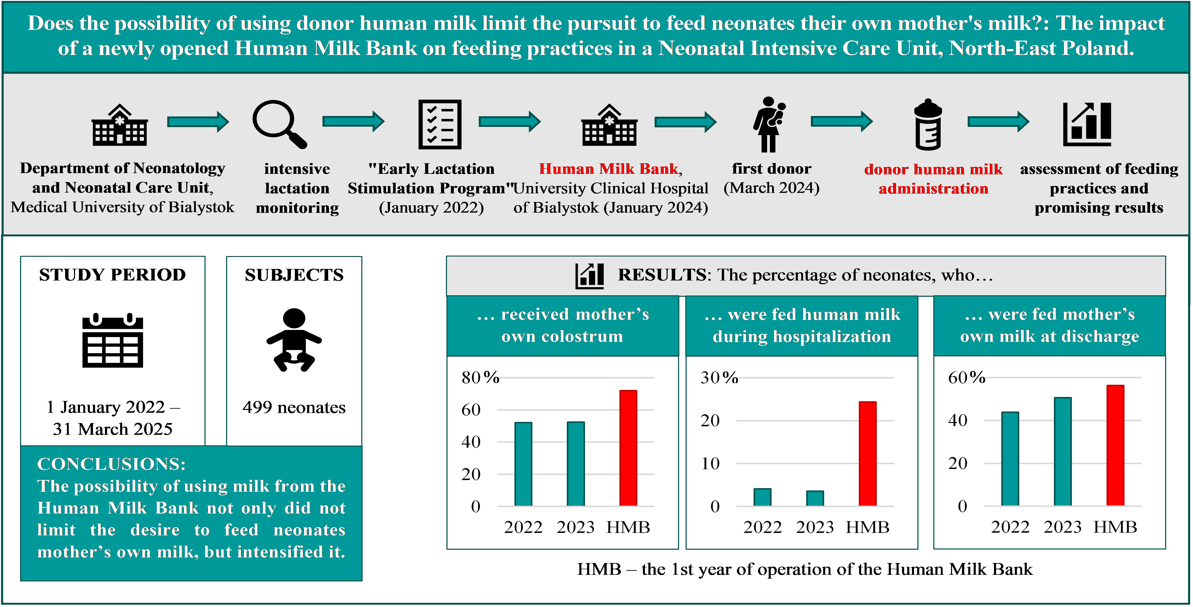 For many years, we have been conducting intensive lactation monitoring at the Department of Neonatology and Neonatal Intensive Care Unit of the Medical University of Bialystok, based on carefully developed procedures. We were satisfied with the quality of feeding of the hospitalized children. However, this was a subjective assessment. In the third quarter of 2021, we conducted an objective analysis of the quality of neonatal nutrition at the Department (based on medical records), which showed a significant need to modify the procedures (in the 4th quarter of 2021, only 12% of neonates hospitalized in the Neonatal Intensive and Intermediate Care Units of the Department of Neonatology received colostrum in the first feeding). In January 2022, we introduced the “Early Lactation Stimulation Program” covering not only our Department but also the Department of Perinatology with the Delivery Room. We paid particular attention to collaboration between the Departments, education, and documenting lactation activities to monitor the effectiveness of the implemented program. We conducted quarterly analyses and introduced modifications. The data analyses showed that the quality of nutrition at our Department was improving quarter after quarter, but there were still situations in which we were unable to obtain colostrum—when the mother was unwell, taking medication, refusing early lactation stimulation, refusing to feed the child with her own milk, or was absent (a child was admitted from another hospital). Therefore, the analysis revealed a significant need for donor human milk from the Human Milk Bank, which was opened at the University Clinical Hospital of Bialystok in January 2024. Our first donor was qualified in March 2024.