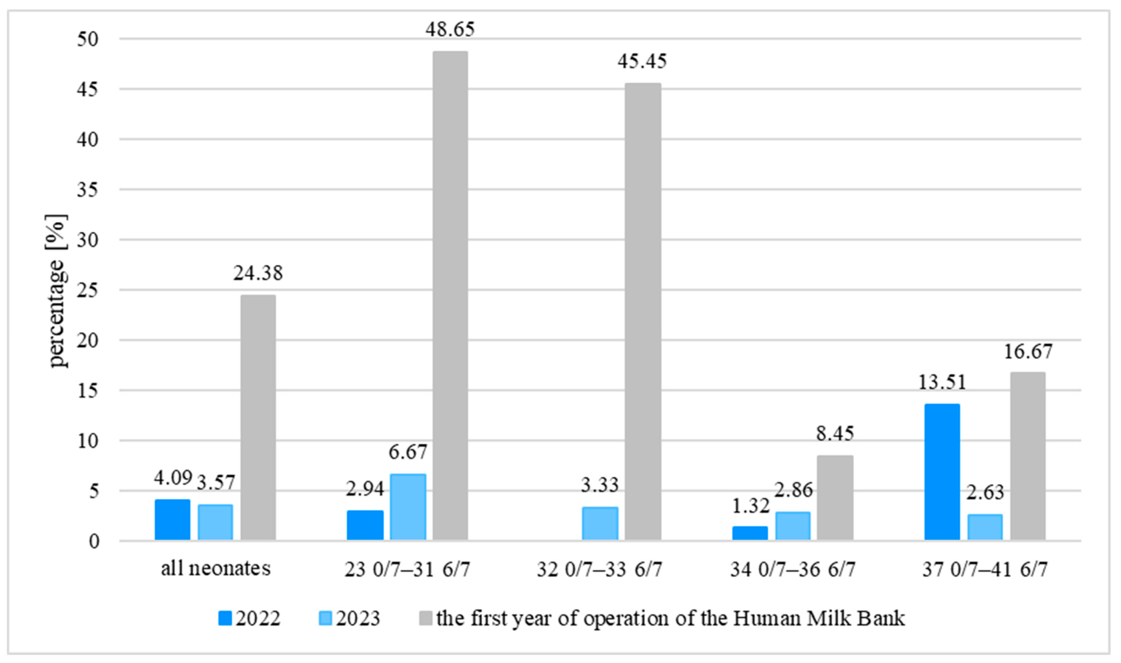 13]. In our study, a significant increase in HM feeding was observed not only in the group of the youngest neonates aged 23 0/7–31 6/7 weeks of gestation (48.65%) but also in the group of older neonates aged 32 0/7–33 6/7 weeks of gestation (45.45%).