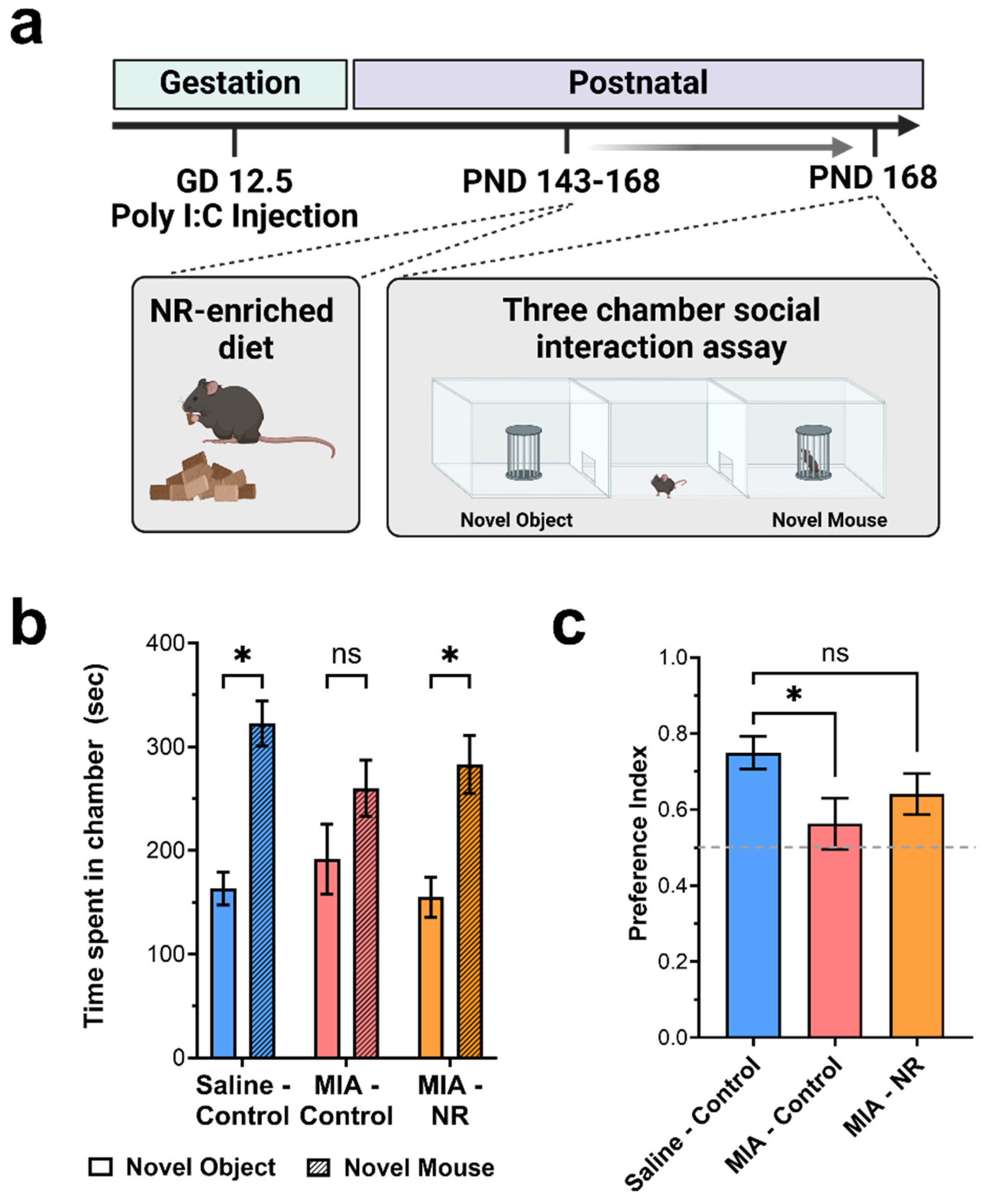 APA StyleBazhin, A. A., Solodnikova, E. S., San Miguel, D. A., Dantzer, R., Ghouri, Y. A., Donegan, J. J., & Goun, E. (2026). Maternal Immune Activation Leads to Mitochondrial Dysfunction and a Social Deficit in Offspring That Is Reversed by Nicotinamide Riboside. Nutrients, 18(6), 889. https://doi.org/10.3390/nu18060889
