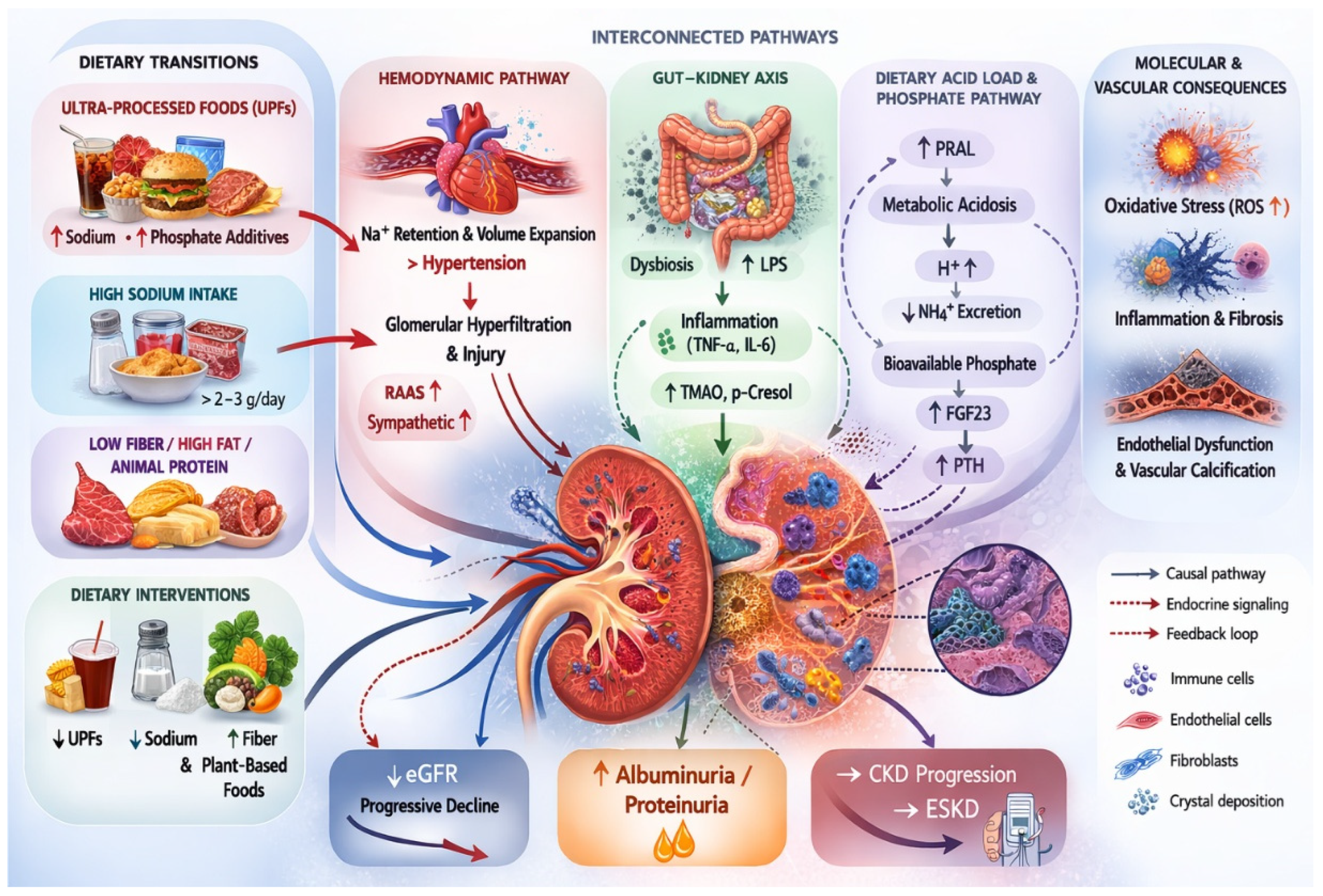 Taken together, this triangulated evidence supports a coherent interpretation: contemporary dietary environments characterized by high intake of ultra-processed foods, elevated dietary acid load, and reduced fiber intake contribute to CKD risk and progression through multiple interconnected pathways. These pathways include sodium-driven hypertension, metabolic acidosis, gut–kidney axis dysregulation with increased uremic toxin generation, and systemic inflammatory and endocrine responses. By consolidating these findings into a single comparative framework,