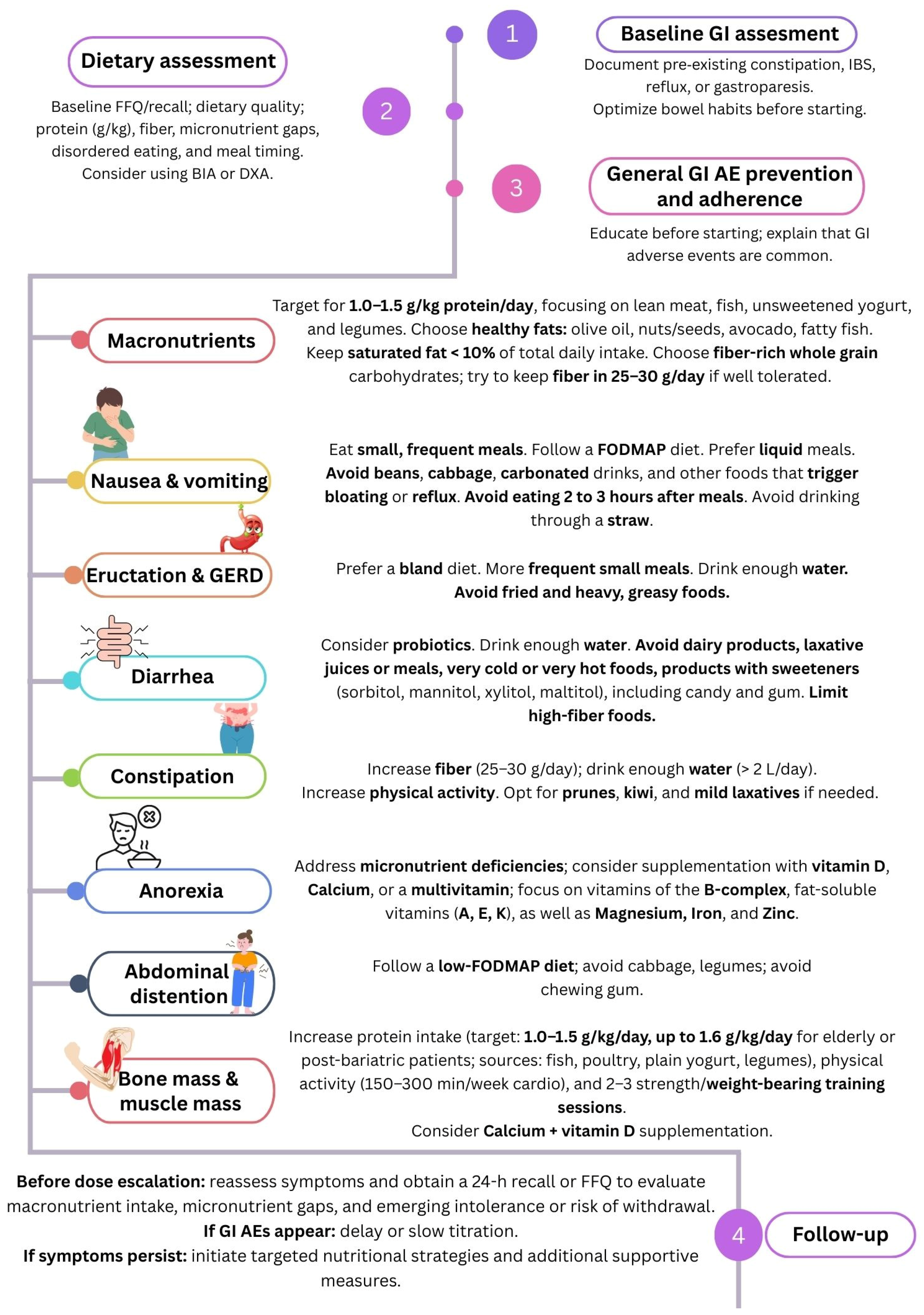 Document pre-existing constipation, IBS, reflux, or gastroparesis; optimize bowel habits before starting; avoid GLP-1 in patients with severe gastroparesis. Adopt the three ‘E’s: Education, Escalation, Effective management [122].