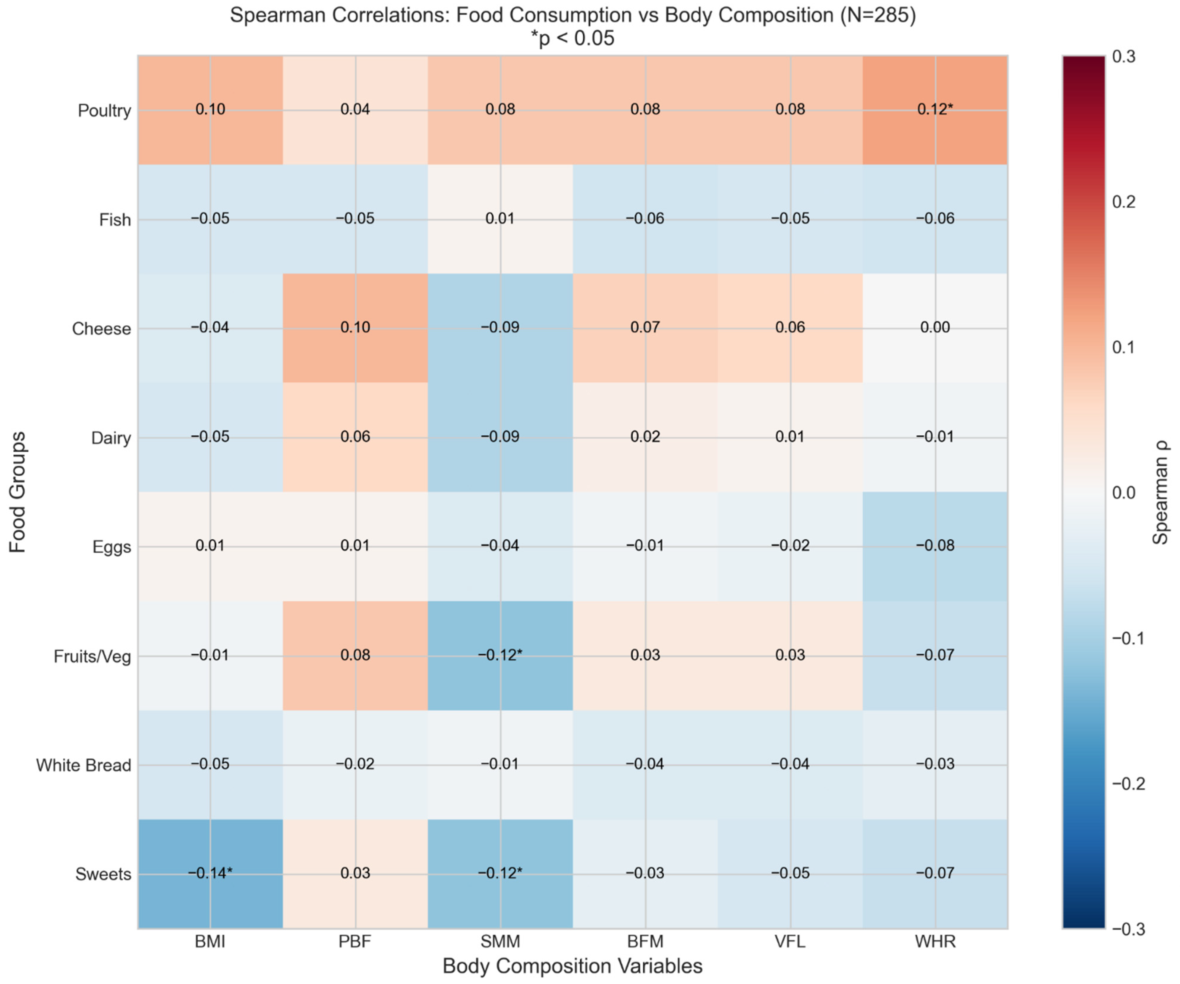 Statistical note on multiple comparisons: After Bonferroni correction, no individual correlations retained statistical significance. However, this study does not aim to establish specific diet–adiposity associations; rather, it demonstrates how BMI-based classification systematically distorts the directionality of associations even when effect sizes are small. The consistent pattern—negative correlations with BMI but positive (or neutral) correlations with PBF across multiple variables—supports our methodological conclusion regardless of individual p-values.