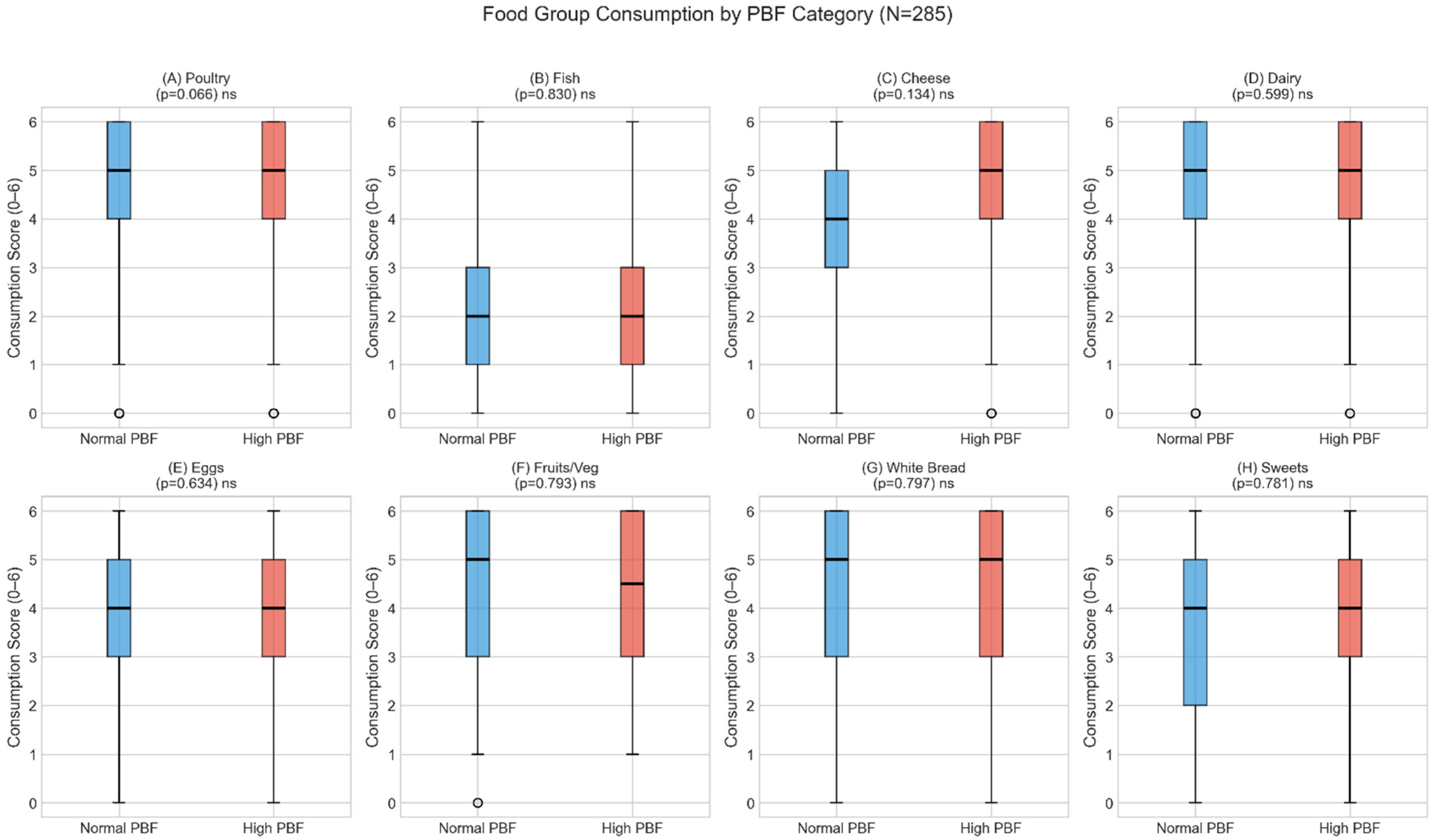 p = 0.591), suggesting that the BMI finding may be an artifact of measurement limitations and reporting bias rather than underlying biological associations. This direction reversal—from negative (BMI) to positive (PBF)—suggests that BMI-based dietary associations may be confounded by both adiposity misclassification [