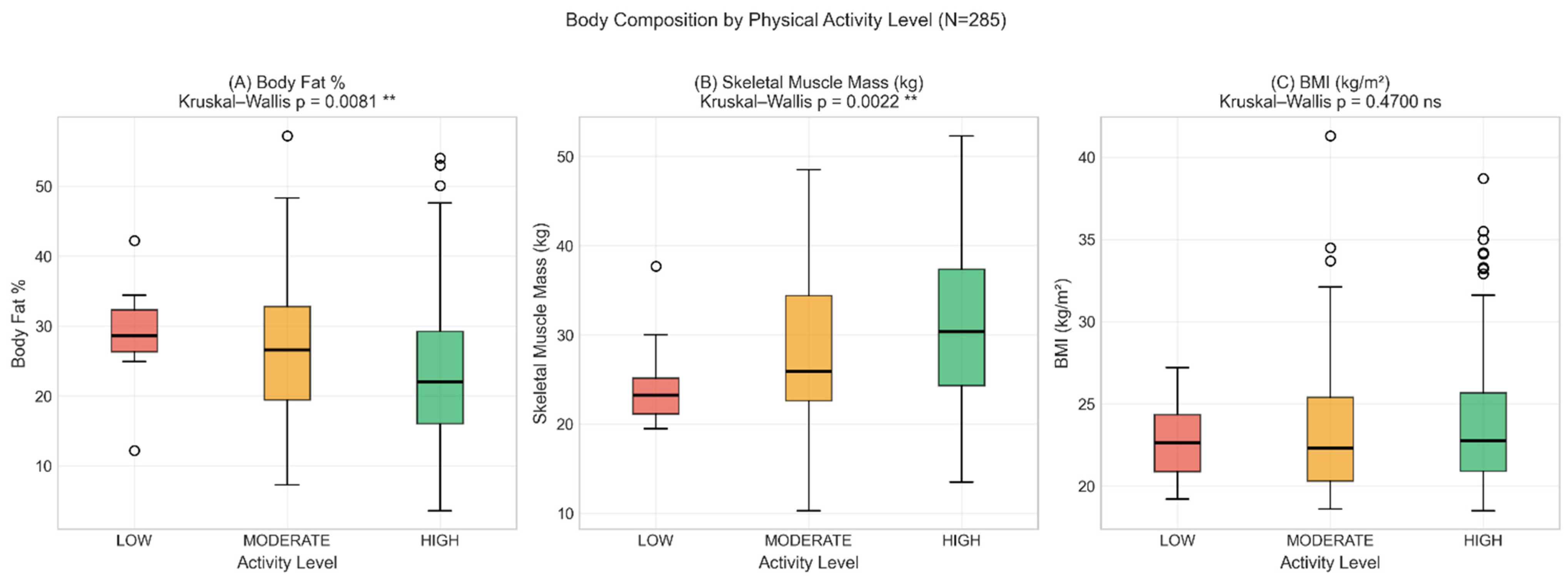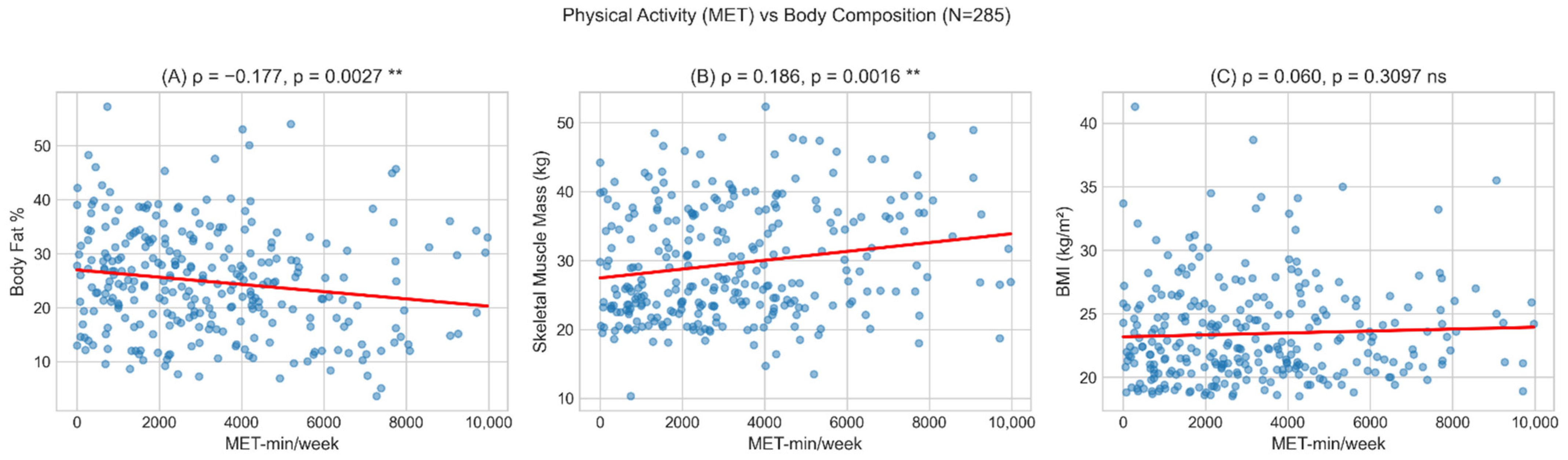 The integration of IPAQ-SF physical activity data provides additional evidence for the limited sensitivity of BMI alone. Physical activity (MET-min/week) showed significant correlations with true body composition measures (PBF: rho = −0.177, p = 0.003; SMM: rho = +0.186, p = 0.002) but no significant correlation with BMI (rho = +0.060, p = 0.310). Individuals who exercise more have lower body fat and higher muscle mass, yet BMI alone may not capture these body composition differences.