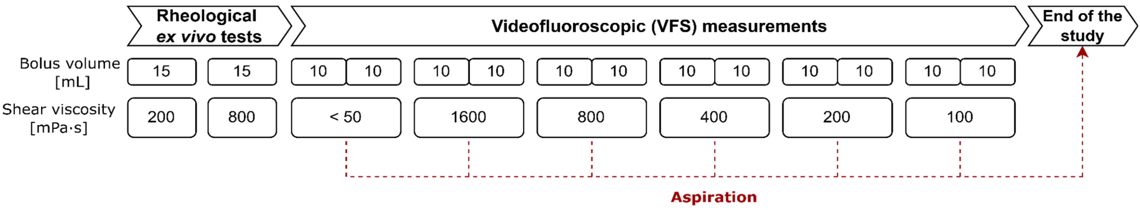 - Bolivar-Prados, M.; Hayakawa, Y.; Tomsen, N.; Arreola, V.; Nascimento, W.; Riera, S.; Kawakami, S.; Miyaji, K.; Takeda, Y.; Kayashita, J.; et al. Shear-Viscosity-Dependent Effect of a Gum-Based Thickening Product on the Safety of Swallowing in Older Patients with Severe Oropharyngeal Dysphagia. Nutrients 2023, 15, 3279. [Google Scholar] [CrossRef]