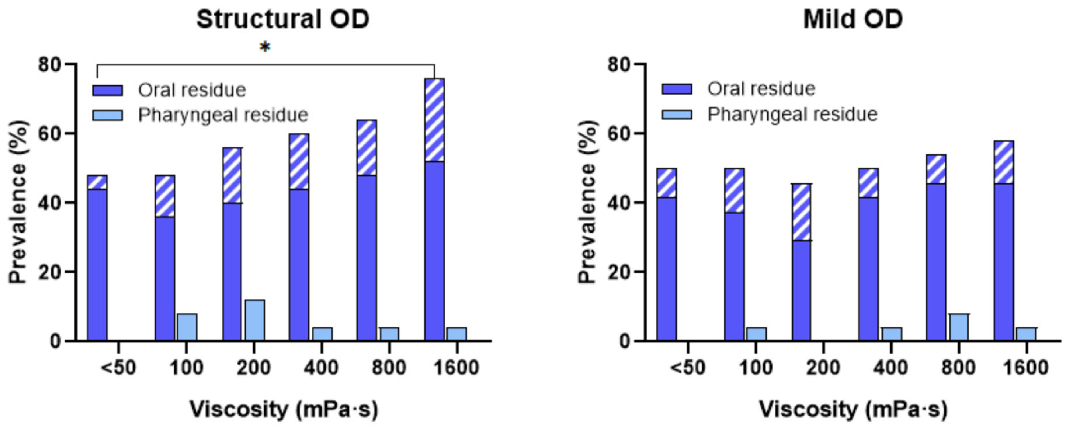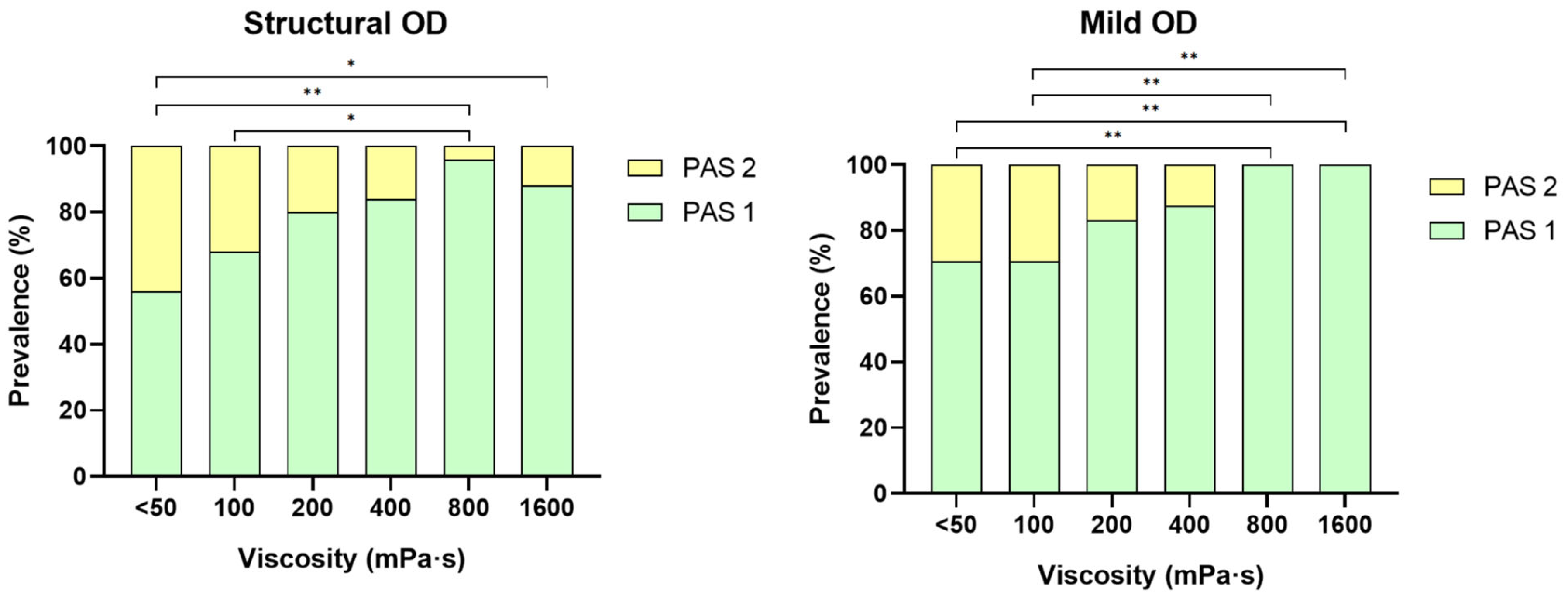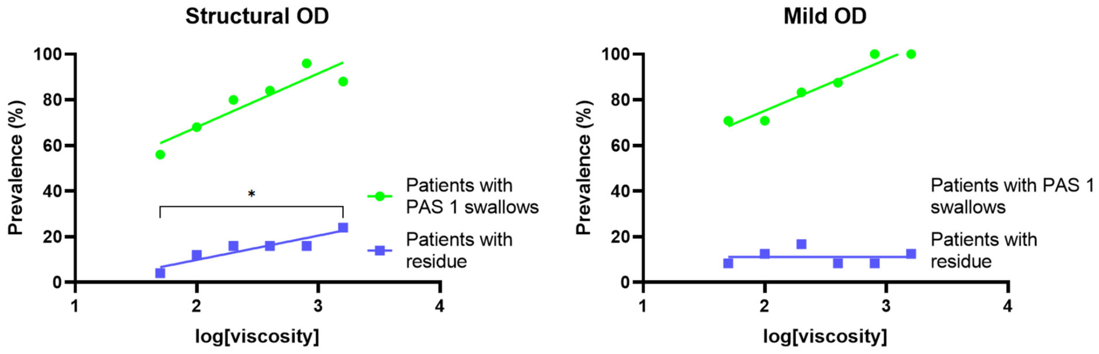 - The inclusion criteria for the mild OD group were based on the baseline VFS assessment. Patients were classified as having mild OD if they presented a PAS score of 1 or 2 (1—material does not enter the airway; 2—material enters the airway, remains above the vocal folds, and is ejected from the airway) at all tested viscosities during this initial evaluation [26] and/or exhibiting signs of impaired swallowing efficacy [27]. Exclusion criteria included impaired safety of swallow in VFS study (PAS ≥ 3), dementia, severe cognitive disorders causing an inability to comply with protocol requirements, and allergy to any study ingredient.