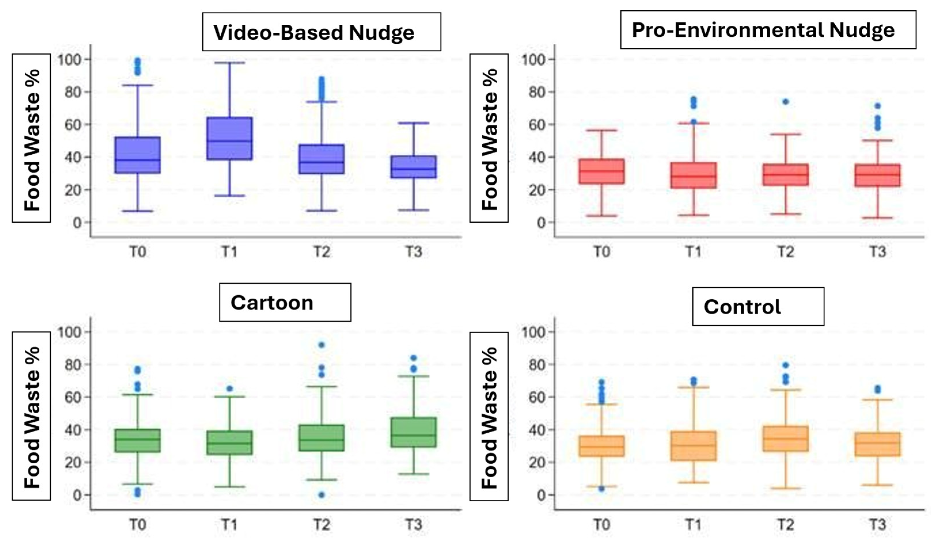Descriptive aggregated observations across repeated experimental periods suggested heterogeneous plate-waste trends across intervention conditions. The sticker condition showed the lowest and most stable waste values over time, whereas the video condition showed greater variability, with a peak at T1 followed by reduction at T2; the fumetto condition showed an initial reduction at T1, followed by a return toward baseline levels at T2. The control condition remained relatively stable early on and increased at the last available observation point [