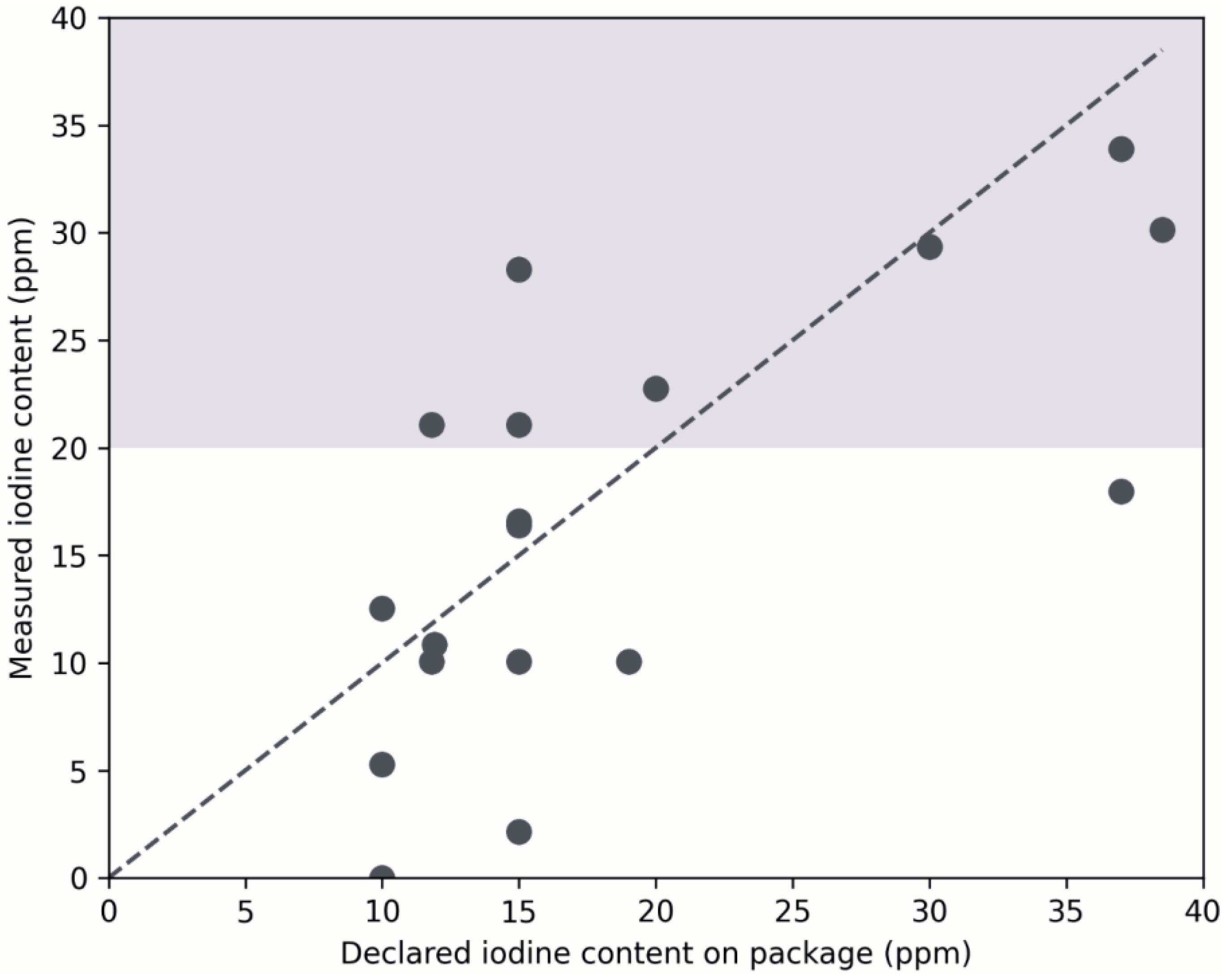 - Abughoush, M.; Olaimat, A.N.; Al-Holy, M.; Al-Awwad, N.J.; Al-Dalali, S.; Al-Hourani, H.; Daseh, L.; Abazeed, B.; Al-Dabbas, M.; Abuawad, B.; et al. Quantitative determination of iodine content in iodized table salt marketed in Jordan as an indicator of compliance with national salt iodization standards: A cross-sectional study. Ital. J. Food Sci. 2024, 36, 72–81. [Google Scholar] [CrossRef]