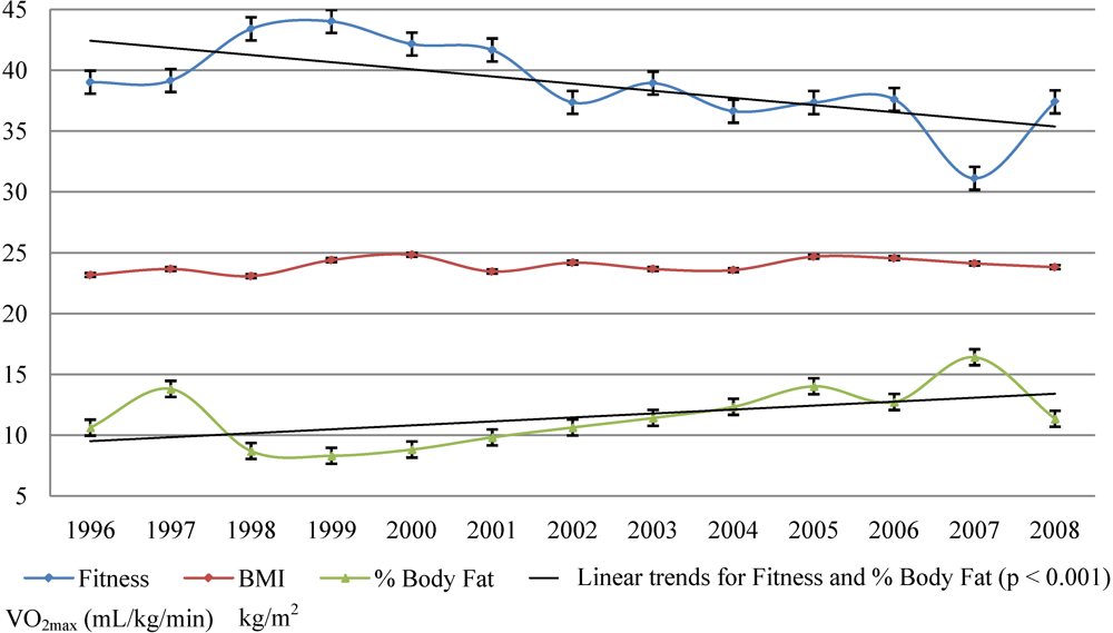 There have been many publications in recent years reporting on the quantity of physical activity among college students using indirect indicators such as steps walked per day or time spent on physical activities. The purpose of this study was to describe the trends of physical fitness related to BMI and body fat among university students between 1996 and 2008. The results showed a significant decline in the average fitness levels measured as an estimation of VO2max for male and female students (p < 0.001 for both sexes). The linear trend for BMI by years was not significant for both sexes (p for males = 0.772, p for females = 0.253). On average, in the last 13 years, % body fat was increasing 0.513%/year for males and 0.654%/year for females. There is a significant indirect correlation between the student’s VO2max levels and % body fat, r = −0.489; p < 0.001 for males; and r = −0.416, p < 0.001 for females. Approximately 23.9% of the variance in the VO2max levels in males and 17.3% in females can be explained by the variance in % body fat. The results support recent findings that physical fitness among college students is declining and body fatness is increasing.