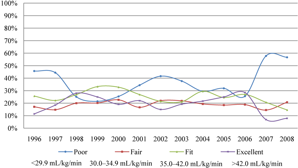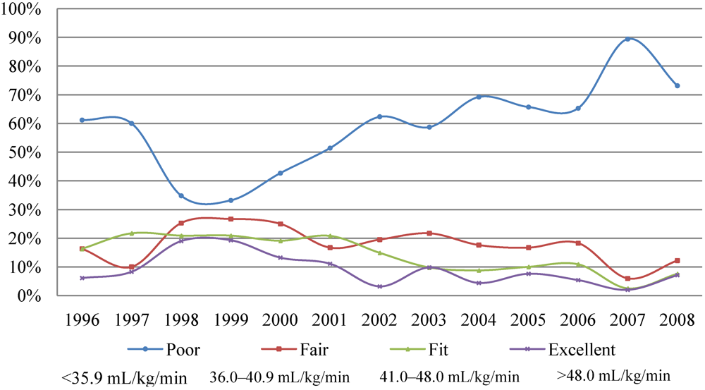 Percentage of males falling into the four difference fitness categories (1996–2008).