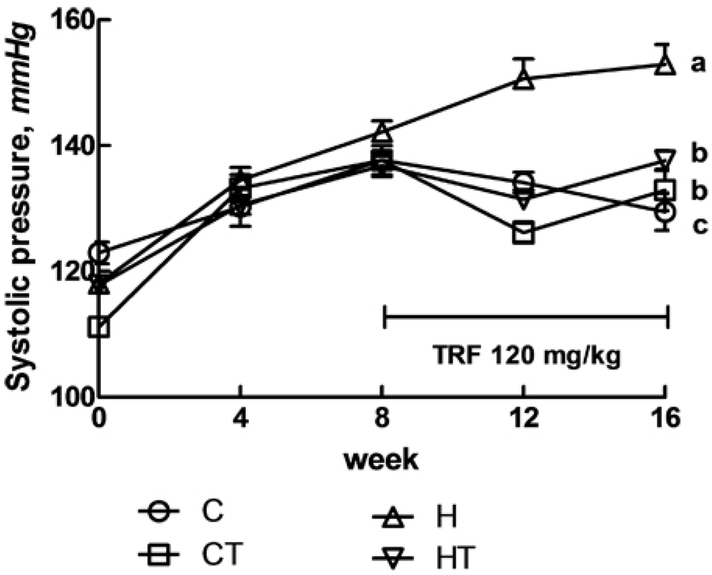 Tail-cuff measurement of systolic blood pressure recorded at 0, 4, 8, 12 and 16 weeks for C, CT, H and HT diet-fed rats. Data shown as means ± SEM. Endpoint means with different letters in each data set are significantly different. n = 8/group.