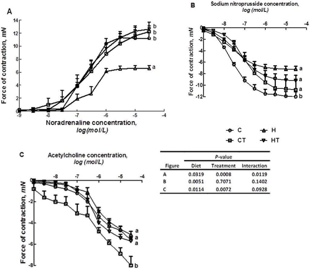 Cumulative concentration-response curves for noradrenaline (A), sodium nitroprusside (B) and acetylcholine (C) in thoracic aortic rings from C, CT, H and HT-diet fed rats. Data shown as means ± SEM. Endpoint means with different letters in each data set significantly differ. n = 8/group.