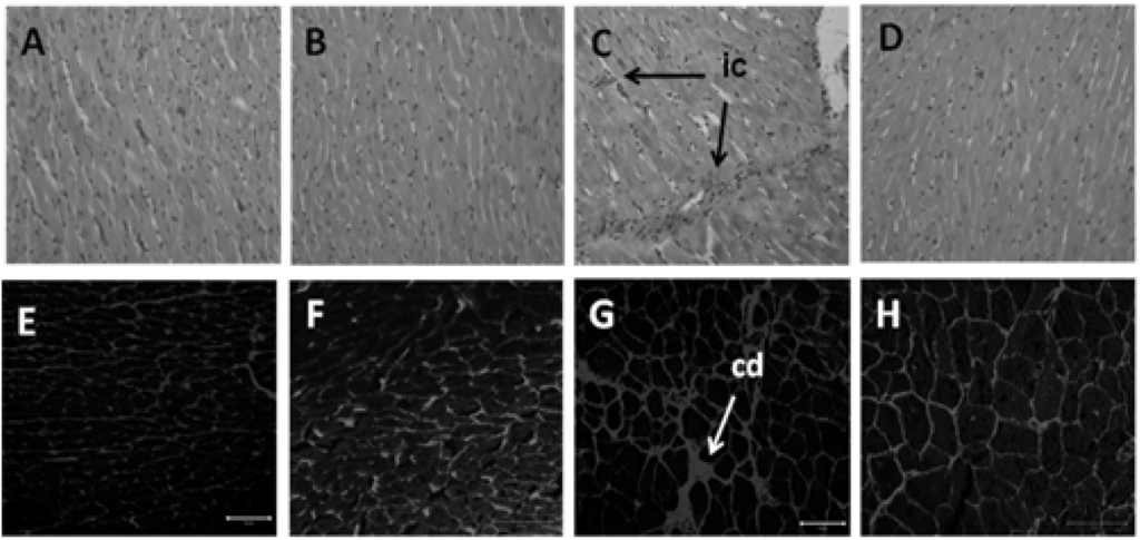 Haematoxylin and eosin staining of left ventricle (20×) showing inflammatory cells (marked as “ic”) as dark spots outside the myocytes in C (A), CT (B), H (C) and HT (D) diet-fed rats. Picrosirius red staining of left ventricular interstitial collagen deposition (40×) in C (E), CT (F), H (G) and HT (H) diet-fed rats; collagen deposition is marked as “cd”.