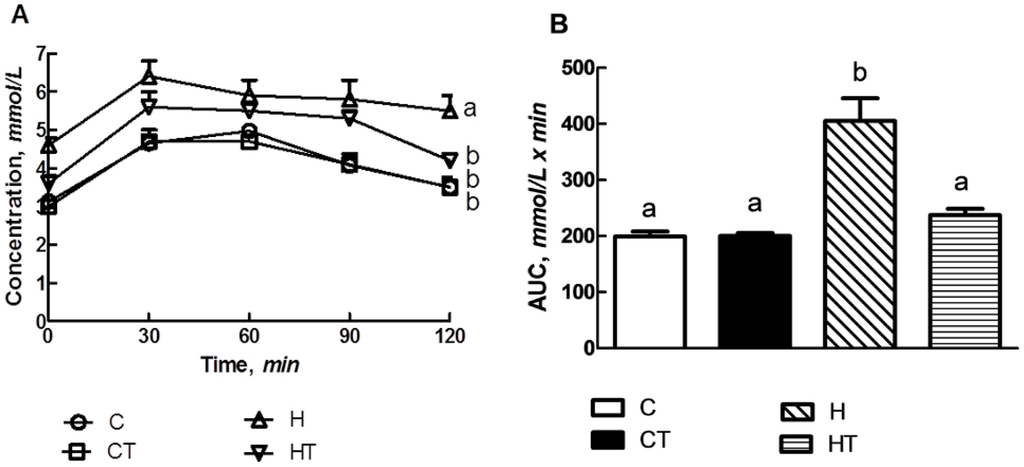 Oral glucose (2 g/kg) (A) and insulin (0.33 IU/kg) (B) tolerance in C, CT, H and HT-diet fed groups. Data shown as means ± SEM. Endpoint means with different letters in each data set significantly differ. n = 8/group.
