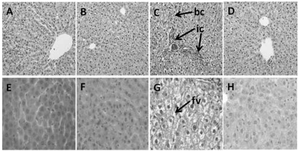 Haematoxylin and eosin staining of hepatocytes showing inflammatory cells around the portal region (marked as “ic”) (20×) in C (A), CT (B), H (C), and HT (D) diet-fed rats and hepatocytes with enlarged fat vacuole (marked as “fv”) (40×) and ballooned hepatocyte (marked as “bc”) in C (E), CT (F), H (G) and HT (H) diet-fed rats.