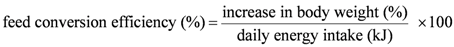| Feed conversion efficiency, % | 2.4 ± 0.2 | 2.2 ± 0.3 | 3.0 ± 0.3 | 2.8 ± 0.2 | 0.0364 | 0.4079 | 0.9615 |