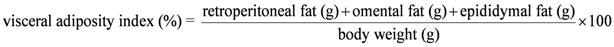 Dual-energy X-ray absorptiometric (DXA) measurements using a Norland XR36 DXA instrument (Norland Corp., Fort Atkinson, WI, USA) were performed on the rats after 16 weeks of feeding, 2 days before rats were killed for pathophysiological assessments. DXA scans were analysed using the manufacturer’s recommended software for use in laboratory animals (Small Subject Analysis Software, version 2.5.3/1.3.1; Norland Corp.) as previously described []. The precision error of lean mass for replicate measurements, with repositioning, was 3.2%. Visceral adiposity index (%) was calculated from wet weights of fat pads at euthanasia as: