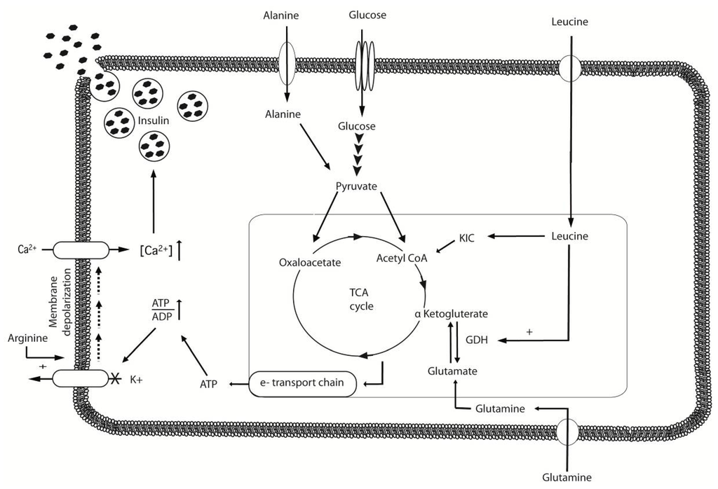 - Sener, A.; Hutton, J.C.; Malaisse, W.J. The stimulus-secretion coupling of amino acid-induced insulin release. Synergistic effects of L-glutamine and 2-keto acids upon insulin secretion. Biochim. Biophys. Acta 1981, 677, 32–38. [Google Scholar] [CrossRef]