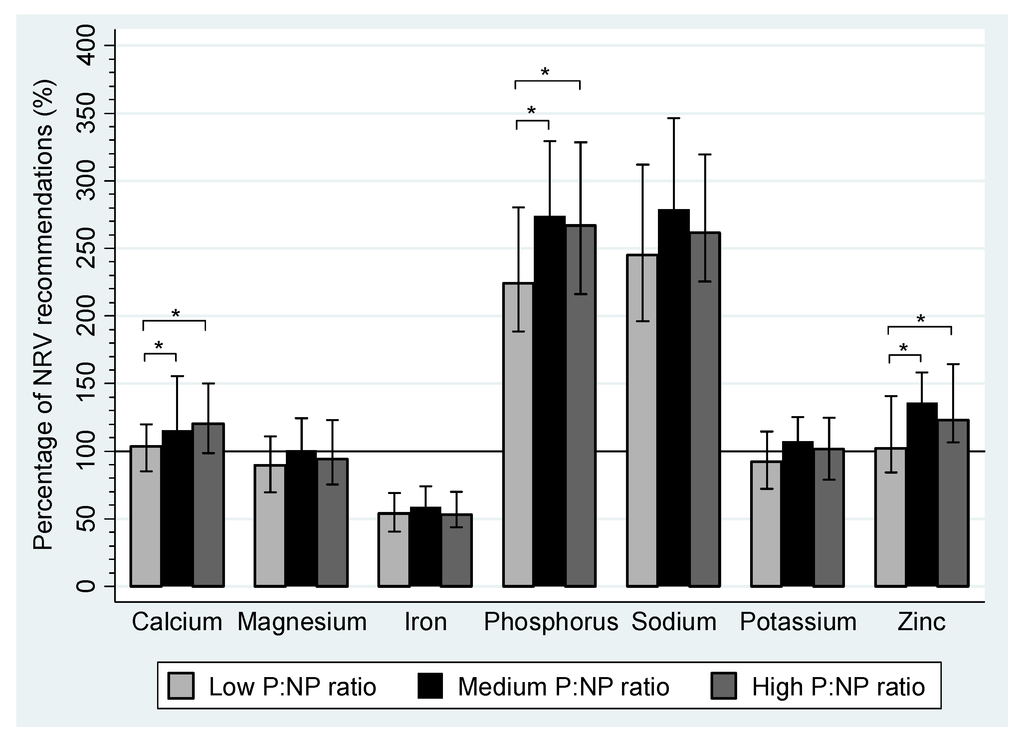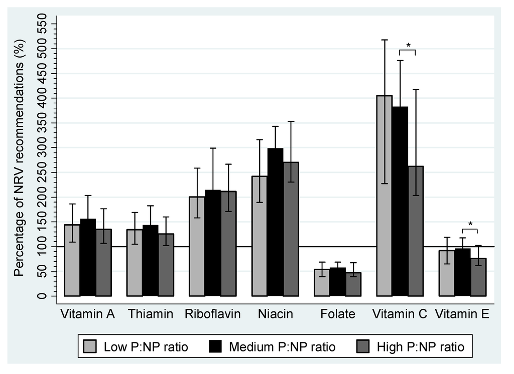 The percentage of NRV recommendations for vitamins and minerals that were achieved by pregnant women are summarized in Figure 1 and Figure 2, respectively. Median daily intakes of vitamin A, thiamine, riboflavin, niacin, vitamin C, calcium, phosphorus, sodium and zinc were above 100% of the NRVs in each tertile. Magnesium and potassium intakes only achieved NRV recommendations in the medium P:NP ratio group and the medium and high P:NP ratio groups, respectively. Folate, vitamin E and iron intakes were suboptimal in all tertiles, with less than 60% of recommendations achieved for folate or iron and 75%–95% of NRVs met for vitamin E. Median daily intakes were the highest in the medium P:NP ratio group for all micronutrients, except vitamin C and calcium.