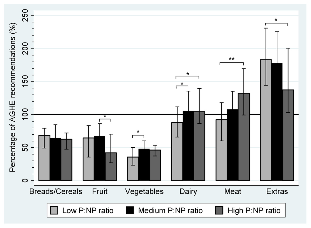 Figure 3 summarizes the percentage of AGHE recommendations achieved by pregnant women according to tertile of the P:NP ratio. None of the women in any tertile achieved the AGHE recommendations for all food groups. The highest adherence rates were for dairy and meat food groups. Pregnant women in the medium and high P:NP ratio groups reported median daily servings of dairy and meat that were above minimum recommendations, while 88.1% and 92.4% of women in low P:NP ratio group met the recommendations, respectively. When food patterns in the low P:NP ratio group were compared to the high P:NP ratio group, adherence rates for dairy (88.1% vs. 104.5%; P = 0.001) and meat (92.4% vs. 132.2%; P < 0.001) food groups were lower, and for fruit (64.6% vs. 42.1; P = 0.014), higher for women in the low P:NP ratio group. Similar adherence rates were found for the bread and cereals food group. Servings of extra foods were compared to the maximum AGHE recommendation of 2.5 servings per day. Despite an inverse association between extra food servings and the P:NP ratio (P = 0.003), women in the high P:NP ratio group still reported intakes 37.3% above the maximum recommendation.