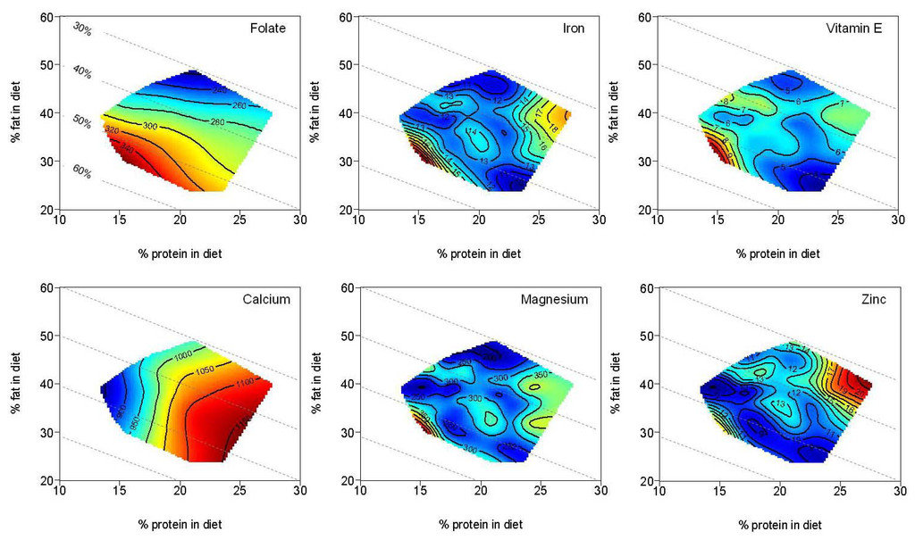 Effects of maternal macronutrient intakes during pregnancy on selected maternal micronutrient intakes. In these plots, known as right-angled mixture triangles [], fat and protein (% of energy) increase along their respective axes in the normal way, and % carbohydrate decreases with distance from the origin. The negatively sloped dashed lines show the % carbohydrate, as labeled in the first graph. Plotted onto arrays of maternal dietary macronutrient composition points are fitted surfaces for the six response variables (folate, iron, vitamin E, calcium, magnesium and zinc). The isoclines for the micronutrient intakes rise in elevation from dark blue to dark red. Therefore, low micronutrient intakes are represented in the dark blue shading and increase to high micronutrient intakes in the red shading. Micronutrient intakes were generally optimized with a maternal diet of intermediate protein (18%E–20%E), intermediate fat (28%E–30%E) and intermediate carbohydrate (50%E–54%E) in comparison to Nutrient Reference Values (n = 149). Folate and iron intakes were maximized with low protein (<16%E), intermediate fat (30%E) and high carbohydrate (>54%E) intakes. Nutrient Reference Values recommended for pregnancy: Folate = 520 μg, Iron = 22 mg, Vitamin E = 7 mg, Calcium = 840 mg, Magnesium = 290 mg, Zinc = 9 mg [].