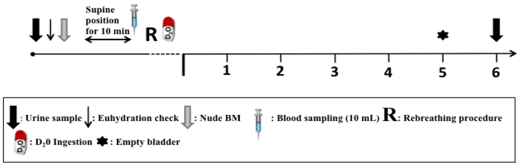 All procedures described below and shown schematically in Figure 1 were carried out on all visits to the laboratory (familiarization, pre- and post-supplementation) with the exception of the TBW measurement, which was only performed in the pre-, and post-supplementation trials. Measurements during the 1st visit to the laboratory (familiarization trial) were only performed to ensure that the participants were introduced to and were comfortable with all procedures and therefore data from familiarization trials were not reported. On arrival to the laboratory, participants provided a baseline urine sample before nude BM was recorded. Euhydration was confirmed, prior to the start of each experiment, by measuring urine osmolality and all subjects were found to be euhydrated (155 ± 55 mOsm/L). Following this, a 21 G cannula was introduced into a superficial vein of the anticubital fossa of the subject’s right arm. Blood samples (10.0 mL) were taken before and after a rebreathing procedure used to measure total Hb mass (tHb-mass) (see protocol below) [16,19,20]. Participants had adopted a supine position 10 min prior to each blood sampling as posture change induces PV shifts, which in turn can influence concentration based measures such as [Hb] and Hct [21] and PV derived from tHb, [Hb] and Hct. Participants were then asked to orally ingest 0.5 g·kg−1 BM deuterium oxide (D2O) in the morning after a baseline urine sample had been collected. D2O is a stable (nonradioactive) isotope of hydrogen, distinguished by its additional neutron. Once orally ingested, D2O mixes with body water and is eliminated from the body along with unlabeled water. The calculation of water intake from D2O elimination is based on the assumptions described by Fjeld et al. [22]. D2O for the present study was purchased from the Doubly Labeled Water (DLW) Resource Center, University of Aberdeen. Participants were instructed to empty their bladder completely at 5 h post D2O ingestion and in order to evaluate the isotopic decay in body water; a urine sample was collected again in a dry plastic container 6 h after ingestion of D2O. Participants were allowed breakfast, a light lunch and were allowed to pass urine and drink as normal within the 6 h period, as consumption of food and fluids during the 6 h period has been shown not to affect the post D2O measurement of TBW [23] For purposes of analysis, the investigator transferred 2.0 mL from all urine samples from the plastic containers to glass vessels and stored at −20 °C until analysis. Urine samples were then sent in one batch to the University of Aberdeen for isotopic analysis by an isoprime isotope ratio mass spectrometer (Isoprime Limited, Earl Road, Cheadle Hulme, Cheadle, UK) coupled to a Eurovector gas chromatatographer (GC; Eurovector, Via Torana, Milan, Italy) fitted with an HT300A autosampler (HTA, Via del Mella, Brescia, Italy) as previously described [24].