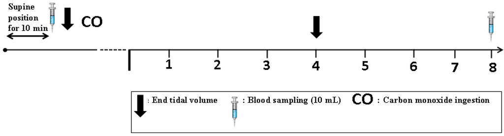The optimized CO re-breathing method was used to determine tHb-mass pre- and post-supplementation and is shown graphically in Figure 2 [16,19,20]. Briefly, a bolus of chemically pure CO dose of 1.0 mL·kg−1 BM was administered with the first breath through a spirometer and rebreathed for 2 min with 4.0 L of oxygen. Change in percent carboxyhemoglobin in venous blood samples (from baseline to 8 min after CO administration), analyzed using a blood gas analyser (ABL 725, Radiometer, Copenhagen, Denmark), was used to determine tHb-mass. In addition, erythrocyte count as well as PV was derived as previously described elsewhere [25]. During pre- and post-supplementation tests, the optimized carbon (CO) monoxide re-breathing method was performed several times (without the use of CO) prior to the ‘real’ measurement. This was done to ensure that subjects were familiar and comfortable with the procedure and to avoid errors and leaks during the actual measurement. Work performed in our laboratory showed that typical error of tHb-mass measurement is <2% and is in agreement with previous findings [19]. Generally, the procedure was conducted in good manner with no leaks being detected during the real measurement and participants of the current study tolerated the procedure well with no signs of CO toxicity.