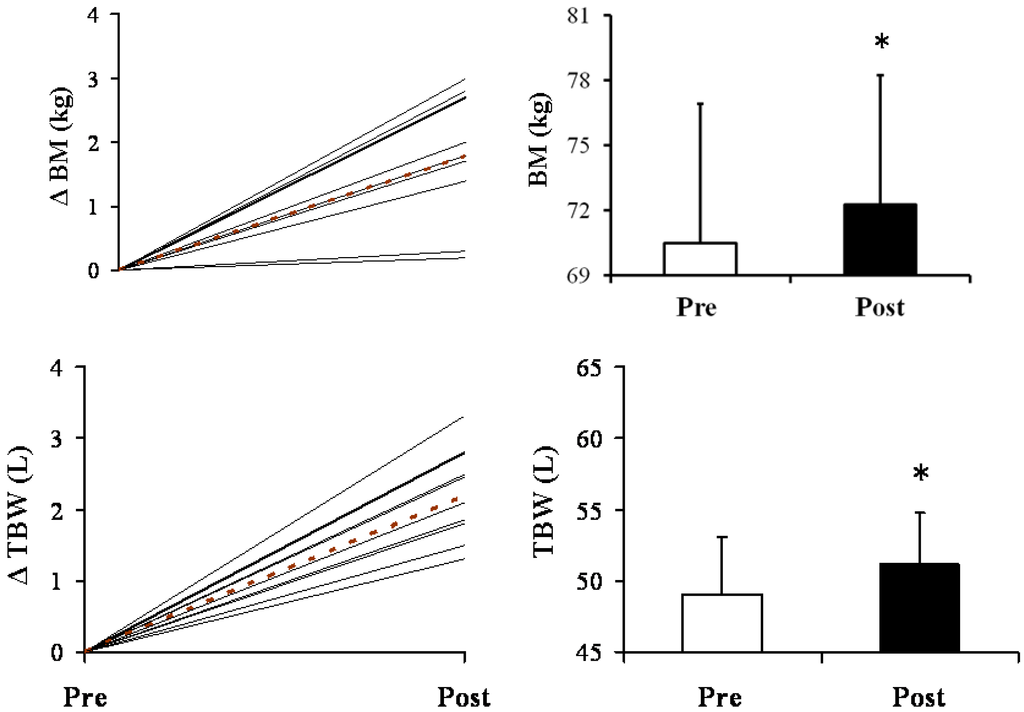 BM and TBW changes are presented in Figure 3. BM and TBW increased significantly following supplementation by 1.1 ± 1.2 and 1.0 ± 1.2 kg (BM, P < 0.01; TBW, P < 0.01; Figure 3), respectively.