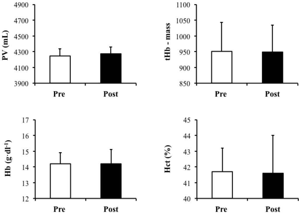 In order to provide an overview of the effects of 7-day supplementation with the hyperhydrating solution containing Gly, Cr and Glu on blood parameters, pre- and post-supplementation values of PV, tHb-mass, Hb and Hct are presented in Figure 4. PV (Pre: 4246.6 ± 424.0 mL, Post: 4274.1 ± 457.7 mL; P = 0.7), tHb-mass (Pre: 936.1 ± 98.6 g, Post: 933.2 ± 94.2 g; P = 0.8), Hb (Pre: 14.3 ± 0.7 g·dL−1, Post: 14.3 ± 0.9 g·dL−1; P =0.9) or Hct (Pre: 41.9 ± 1.5%, Post: 41.7 ± 2.3%; P = 0.8) were not significantly different between pre- and post-supplementation.