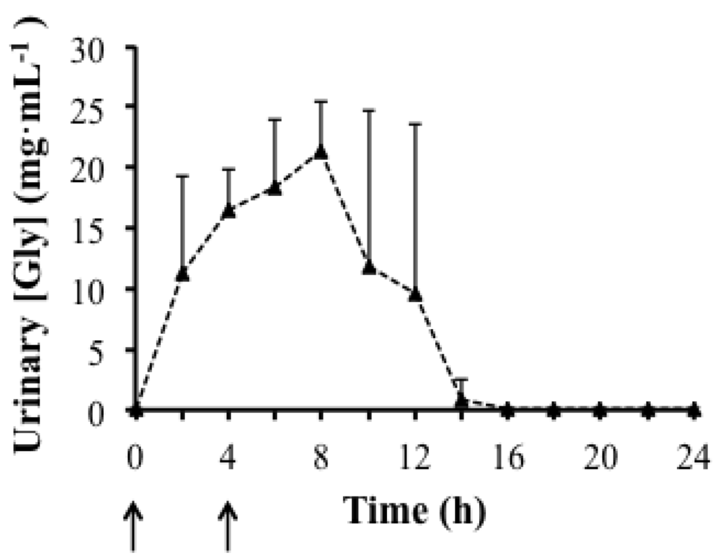 Mean ± S.D. values of urinary excretion of Gly (mg·mL−1) pre- (0 h) and post-supplementation (2–24 h) of the hyperhydrating solution containing Gly, Cr and Glu. N = 6; ↑: ingestion of 1st and 2nd solution at 0 h and 4 h, respectively.