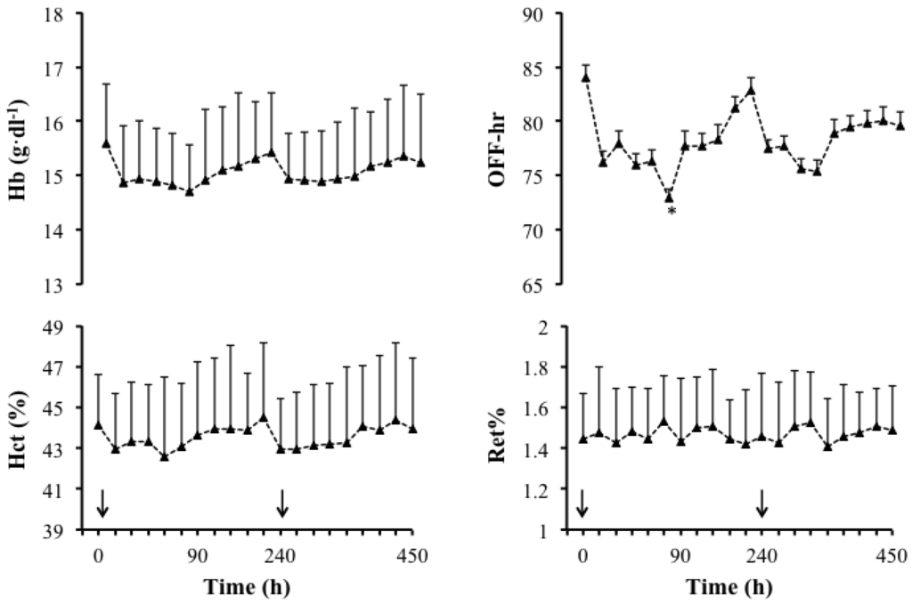 Mean ± S.D. values of Hb concentration (g·dL−1), Hct (%), OFF-hr score and Ret% pre- (0 h) and post-supplementation (2–24 h) of the hyperhydrating solution containing Gly, Cr and Glu. N = 6, ↓: ingestion of 1st and 2nd solution at 0 h and 4 h, respectively. * Significant (P < 0.05) difference between pre- and post-supplementation.
