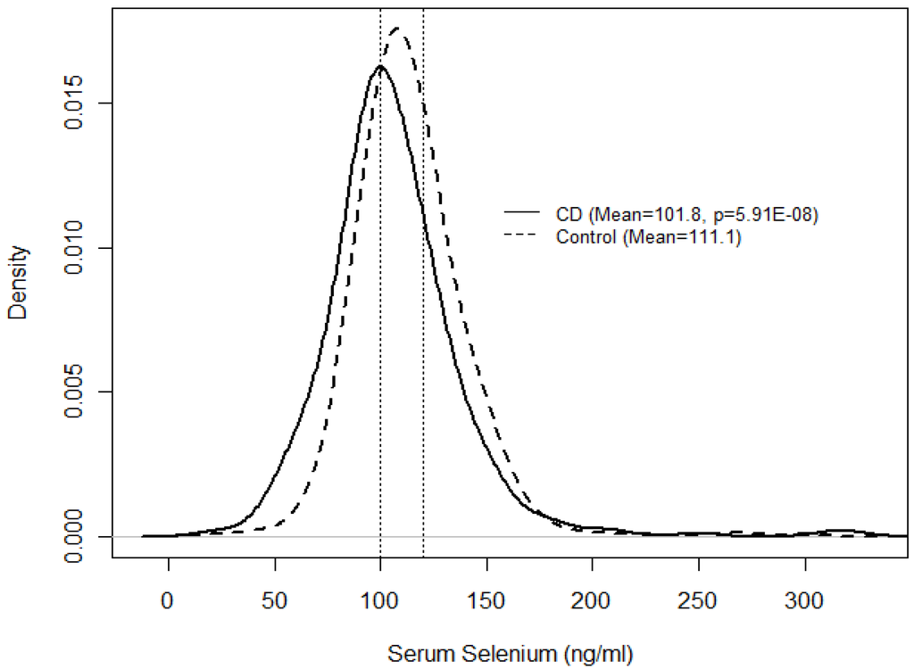 In a Caucasian population residing in New Zealand we evaluated 29 SNPs in seven genes that might play a direct or indirect role in CD pathogenesis. Some of the SNPs associated with CD in this cohort have been reported elsewhere [23,26,27,28], whilst others do not appear to have been reported. Here we focus on the gene-serum selenium interaction on CD.