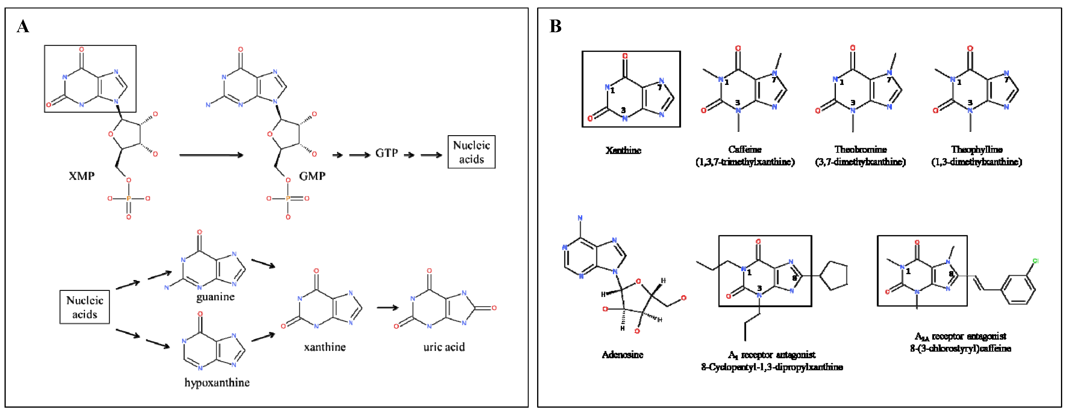 (A) Xanthine as an intermediate of GTP and nucleic acid anabolism and catabolism. Rectangles in compounds highlight the xanthine unit; (B) Structures of methylxanthines, adenosine, and adenosine receptor antagonists structurally related to methylxanthines. Rectangles in compounds highlight the xanthine unit.