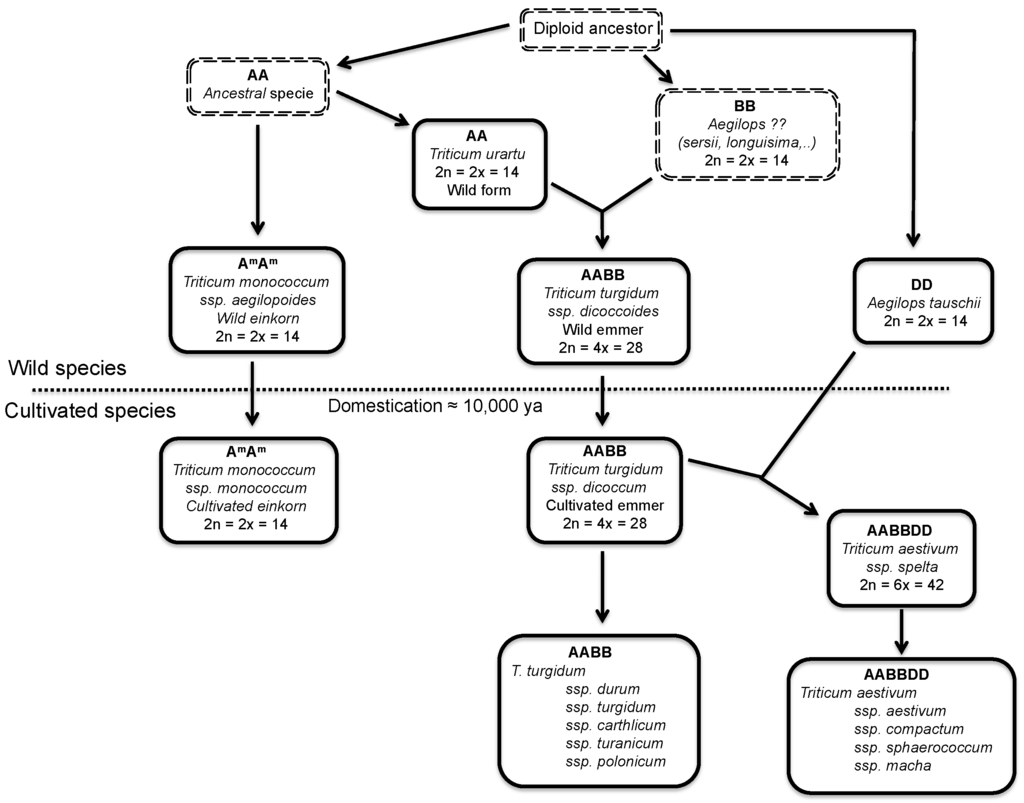 Cultivated wheat is genetically very complex due to its origin from ancestral diploid species through a process of natural hybridization and subsequent polyploidization. The two wheat species of agricultural importance, the pasta wheat, and the bread wheat, are tetraploid (two genomes, AABB) and hexaploid (three genomes, AABBDD), respectively (Figure 1). The tetraploids originated in nature through spontaneous hybridization of two diploid species, each donor genomes A and B, between 0.5 and 2 million years ago. Bread wheat (AABBDD) originated in the fields, about 8000 years ago, through spontaneous hybridization between durum wheat (AABB) and Aegilops tauschii, the diploid donor of the D genome (Figure 1).