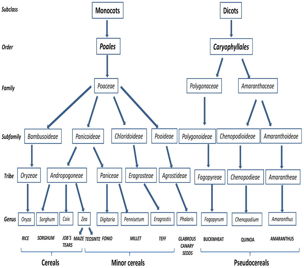 Taxonomic relation of known non-toxic cereals, minor cereals and pseudocereals in the context of celiac disease.