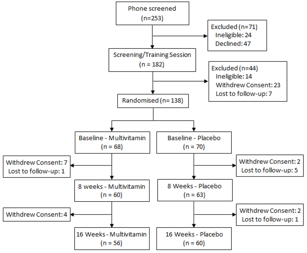 The study was a 16-week, double-blind placebo-controlled parallel groups design. Participants were randomized to receive either Swisse Ultivite Formula 1® (Men’s/Women’s formula) multivitamin or placebo. Treatment randomization was conducted separately for Males and Females by the Supplier: Swisse Vitamins Pty Ltd. Participants were provided with enough treatment for the duration of the 16-week trial, and were instructed to take one tablet daily with, or immediately following breakfast. The Swisse multivitamin major ingredients include B vitamins as well as vitamins C, D and E, together with select mineral chelates and small quantities of select botanicals. Quantities of B vitamins were as follows: B6 pyridoxine hydrochloride 30 mg (men’s)/50 mg (women’s), B9 folic acid 500 μg (men’s)/500 μg (women’s), B12 cyanocobalamin 30 μg (men’s)/50 μg (women’s). Both multivitamin preparations contained a blend of vitamins exceeding recommended daily intakes (RDI) for Australia [31], as well as minerals such as calcium, magnesium, potassium and iron. The multivitamin preparations also contain a range of antioxidants and medicinal herbs including Ginkgo biloba, Panax/Siberian Ginseng, Vitis vinifera, Silbybum marianum (St. Mary’s thistle) and Camellia sinensis (Green Tea). Though the two formulations are roughly equivalent, the amounts of certain nutrients vary slightly, e.g., the women’s formula contains higher levels of calcium and iron, and there are a small number of herbal plant extracts unique to each preparation. A complete list of the Men’s and Women’s Ultivite Formula 1® ingredients can be obtained from the corresponding author. The placebo tablets were matched in size and color to the multivitamin tablets, and included a small amount of riboflavin (2 mg) so as to provide a similar urine coloration effect.