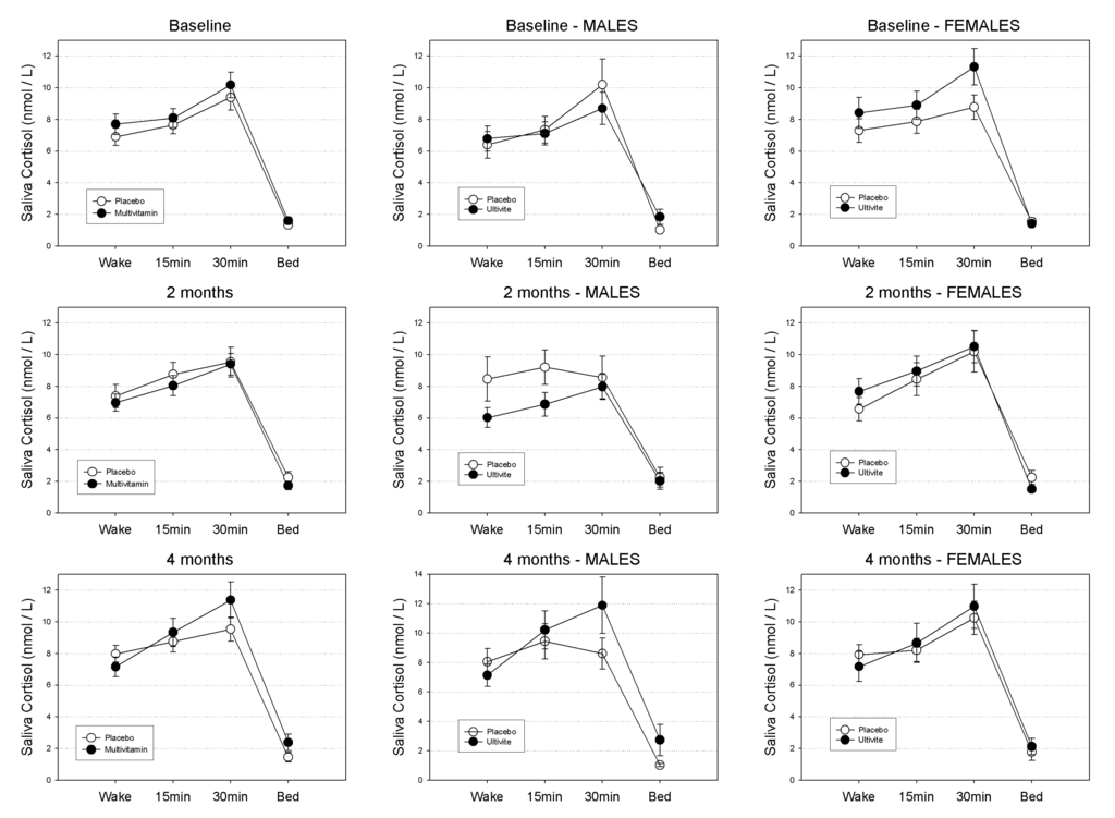 It is worth noting that in recently published findings from our group [30] few differences between the two groups were found in this sample in regards to chronic general health and mood outcomes (including GHQ-28, POMS, Chalder fatigue). However, it is noteworthy that for the male participants at week-16 there was a trend towards an increase in state-trait anxiety (STAI-S) in response to an acute stressor in the MV group [30]. Whilst it is difficult to interpret the relationship between anxiety experienced in relation to an acute stressor and diurnal cortisol secretion that was sampled the day before, this finding is intriguing considering that a trend-level increase in CAR was also observed for male participants in the current study from baseline to week-16. In future research, cortisol response in relationship to an acute stressor on the same day of testing may provide further insight into the hypothesis that multivitamin supplementation may ameliorate the effects of acute stress [11,17]. Finally, in future research the acute effects of multivitamin supplementation on diurnal cortisol secretion could be more clearly dissociated from chronic effects by instructing a subgroup of participants to refrain from taking their treatment on the day of saliva collection. In consideration of the fact that participants took multivitamins each morning, presumably within the first hour of waking, it is possible that acute effects may have had additional influence on cortisol secretion.