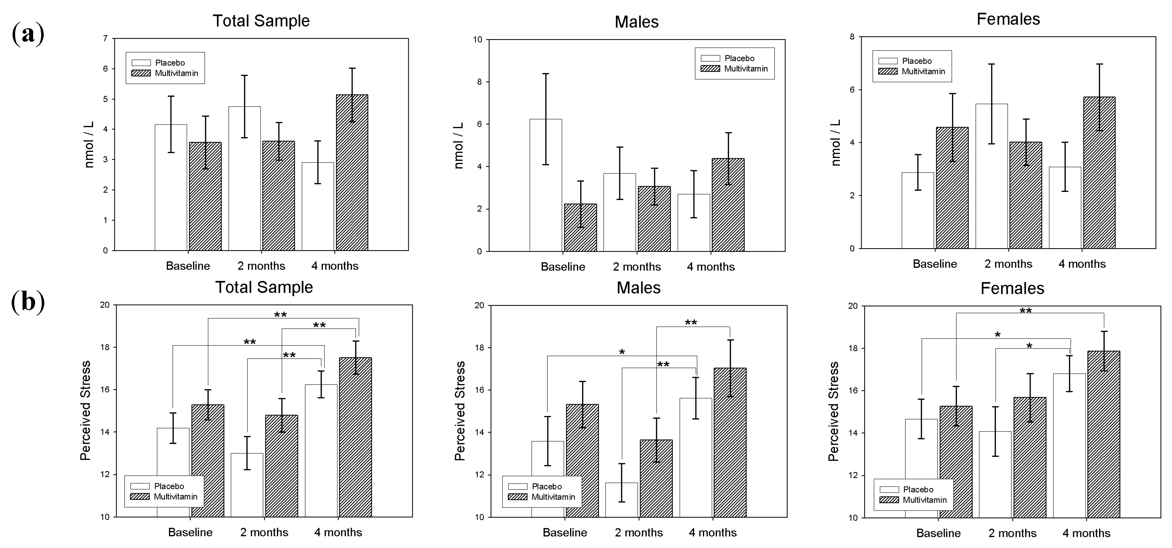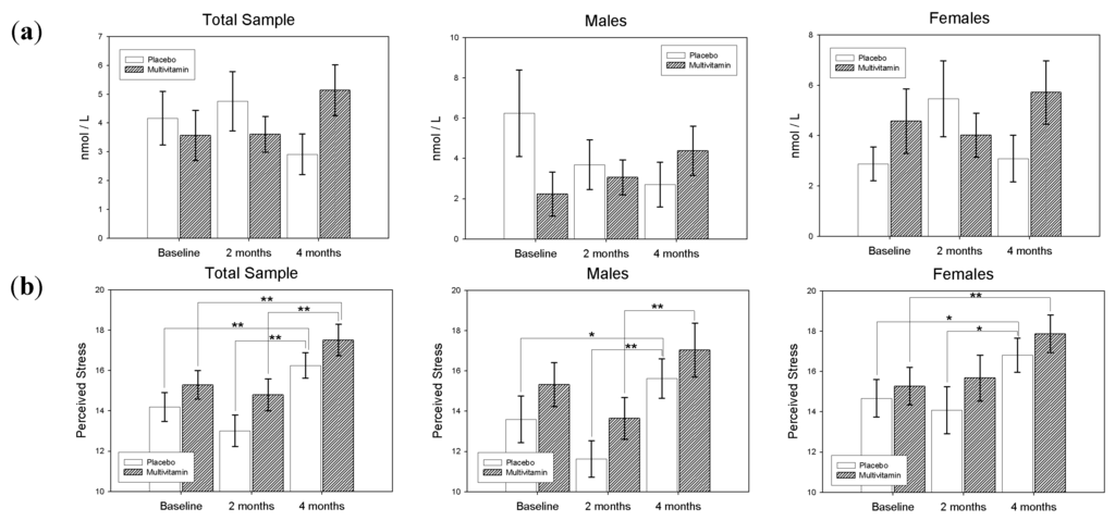 Similarly, for Females the main effect for treatment (F(1,76) = 1.09, p-value = 0.30) was non-significant, and the treatment by visit interaction was also non-significant (F(2,76) = 0.35, p-value = 0.71). However, the main effect for visit was found to be significant (F(2,76) = 5.96, p-value < 0.0039). Differences of Least Squares Means revealed a significant increase in PSS score from baseline to 16-weeks (t(76) = −2.05, p-value = 0.01, d = 0.32) and from 8 to 16-weeks (t(76) = −2.19, p-value = 0.03, d = 0.35) for the placebo group. A significant increase in PSS was also observed from baseline to 16-weeks (t(76) = −2.68, p-value = 0.0089, d = 0.43) and a near-significant increase in PSS from 8 to 16-weeks (t(76) = −1.9, p-value = 0.06, d = 0.31) in the multivitamin group. However, no significant differences between groups were found at any time point. Differences in PSS scores according to treatment group and gender are displayed in Figure 3.