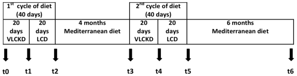During the KEMEPHY period the subjects followed a commercially available protocol called TISANOREICA® [13,14,15]. Two weight loss intervention periods were used as previously available clinical data (unpublished) suggested that this was required to achieve a 10% weight loss. Subjects were analyzed at seven time points: before starting the diet (t0), after K1 (t1), after LC1 (t2), after M1 (t3), after K2 (t4), after LC2 (t5) and after M2 i.e., approximately one year after first visit (t6)—see Figure 1. All subjects gave their informed consent to data use and the study was approved by the Ethical Commission of the Department of Biomedical Sciences of the University of Padova. Efforts to maximize retention in the protocol included e-mail and telephone reminders for appointments and a weekly phone call to verify compliance.