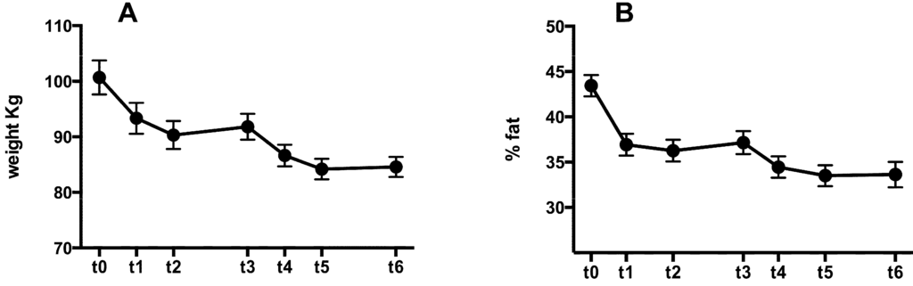 The present study was designed as a retrospective analysis of the medical records of patients followed by our private nutritional service held in three fitness and “weight control” centers in Veneto and Emilia Romagna regions (Italy) between 2006 and 2010. Patient charts were examined from the first clinical evaluation until after one year of dietary therapy supervised by a healthcare professional. The exclusion criteria from the baseline sample included: endocrine disease and cancer, which might induce weight variation, and severe mental illness. Inclusion criteria was BMI > 30, age between 25 and 65 years. Of 327 patients analyzed, 89 obese subjects were selected that underwent a ketogenic Mediterranean diet with phytoextract (KEMEPHY), of these 81 fulfilled our inclusion criteria for this retrospective analysis: no use of antidepressant drugs, no diabetes and no change in quantity and quality of physical activity during the analyzed time period. Of these 81 subjects, 68 completed the one year follow up protocol (84%). The general characteristics of the 68 remaining subjects analyzed were: age 49.17 ± 10 years, height 167 ± 10 cm, weight 100.67 ± 16.54 kg, BMI 35.82 ± 4.11. All subjects were Caucasian (59 males, 12 females). During the first medical visit (t0) subjects were educated on the KEMEPHY protocol and underwent anthropometric measurement, body composition and blood analysis. The year of treatment involved: