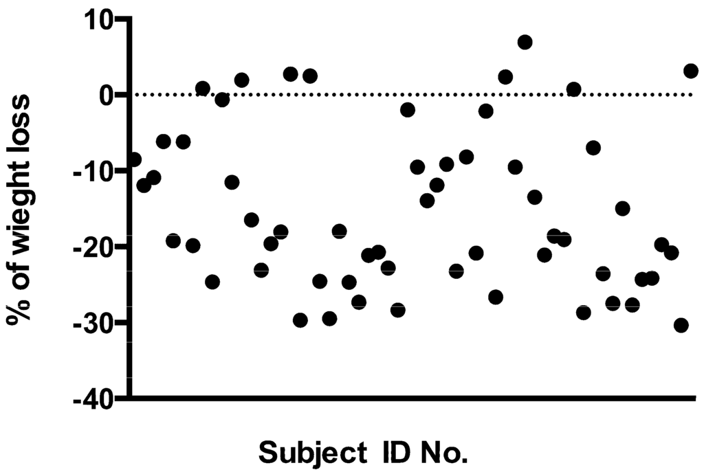 Changes in weight (% of change) of each subject (t6 compared to t0). Basal value is represented by the line zero. Each circle represents a single subject.