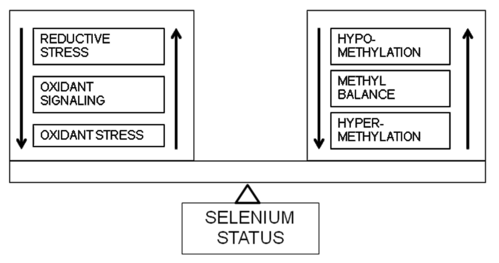 Similar to its effects on redox balance, selenium also influences methylation balance as described above and illustrated in Figure 1. Methylation of CpG dinucleotides in gene promoter regions leads to suppression of gene expression. Hypomethylation has the opposite effect. The effects on gene methylation are variable in the adult state, with generalized DNA hypomethylation found to coexist with hypermethylation of specific genes []. As shown in Figure 1, Figure 2, selenium may affect not only the balance between various redox states and different methylation states, but could integrate the redox-methylation balance itself, as shown in our recent study []. The effect on redox-methylation balance may explain the variability seen in the effects of selenium in health and disease.