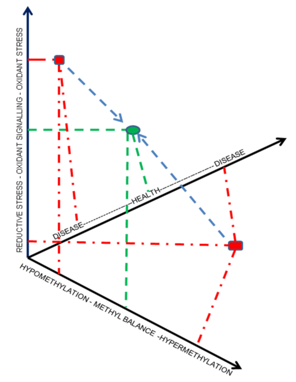 Selenistasis—Selenium integrates redox-methylation balance in health and disease. The X-axis represents methylation status, the Y-axis represents redox state, and the Z-axis represents the continuum from health to disease states. The green oval represents normal oxidant signaling and methylation balance in health. The red square and red rectangle represent two possible combinations of changes in redox and methylation states in disease. Blue arrows delineate the desired effect of interventions in diseased states, i.e., to alter redox and methylation states and, thereby, approximate selenistasis.