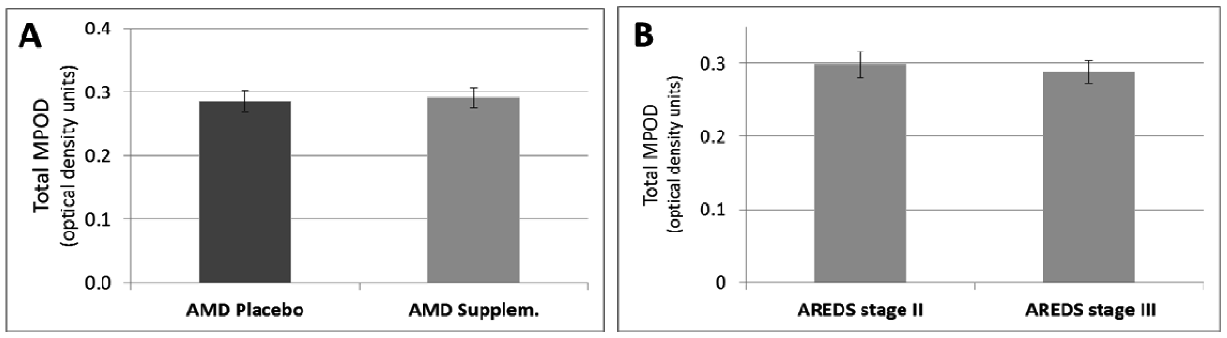 (A) MPOD in AMD patients with placebo and AMD patients with supplementation. (B) MPOD separately for the Age Related Eye Disease study (AREDS) categories 2 and 3. Data are presented as means ±S.E.M.