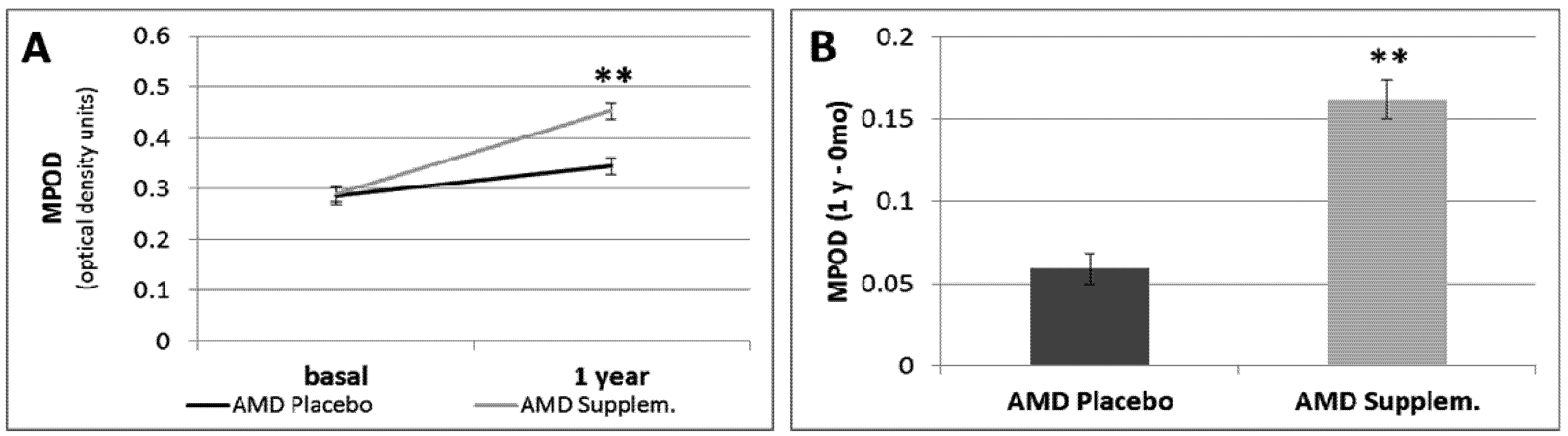 (A) MPOD in AMD placebo group and AMD supplemented group at time 0 (basal) and one year after treatment. (B) The MPOD change (1 year–0 month) in AMD placebo group and AMD supplemented group. Data are presented as means ±S.E.M. ** p <0.01.