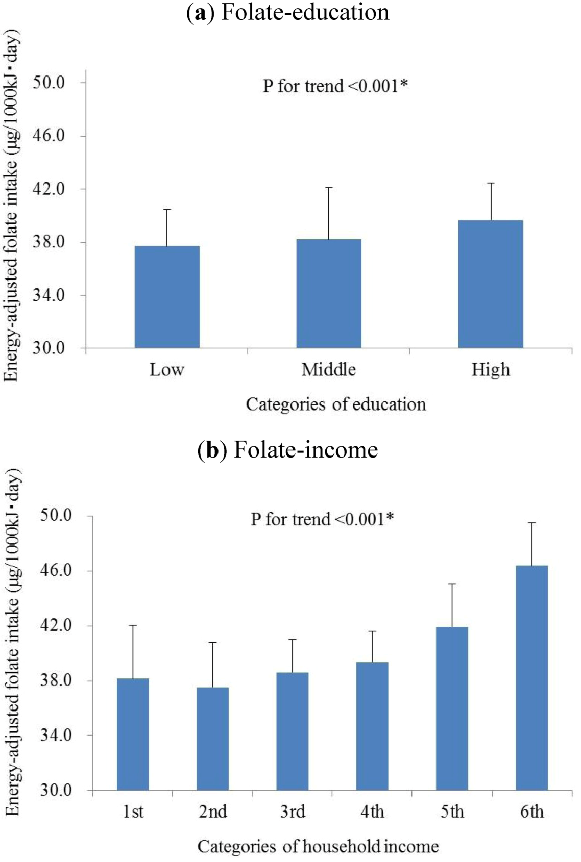 In a trend test in which SES factors were used as categorized variables, the age-, sex- and total energy intake-adjusted folate intake level of each subject was calculated, and the mean adjusted values were compared between subgroups. There were significant linear increases of the folate intake levels as the education (Figure 1a, p for trend <0.001) or income (Figure 1b, p for trend <0.001) increased.