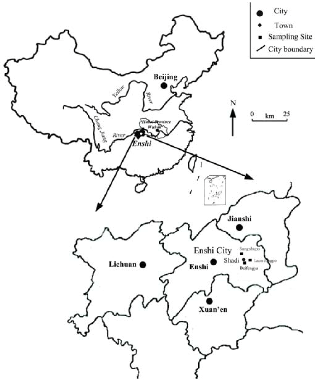 Samples were collected from Shadi, one of the areas with the greatest number of human selenosis cases (Figure 1). Shadi had high soil Se concentrations with an average of 17.04 mg kg−1 dry weight (DW) and a range of 11.26 to 27.50 mg kg−1 DW [20]. The sampling sites included three villages, Laoxiongpo, Beifengya and Sangshupo, in the township of Shadi.