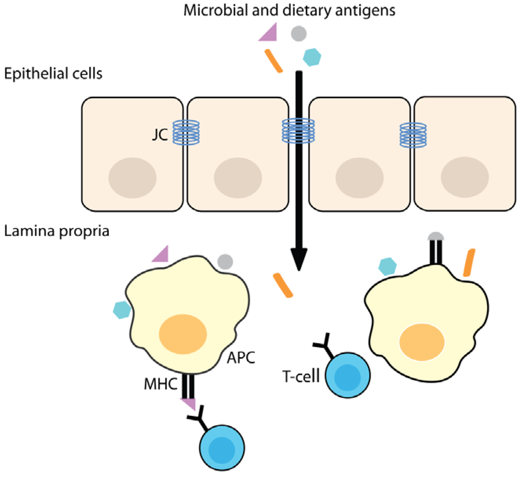 Increased intestinal permeability allows for the passage of microbial and dietary antigens across the epithelial layer into the lamina propria, where these antigens can be taken up by APC and presented to T-cells. JC, junctional complex.